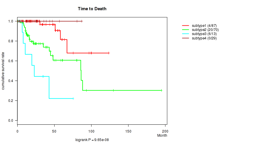 4 subtypes identified in current cancer cohort by 'MIRseq Mature cHierClus subtypes'. These subtypes correlate to 'Time to Death', 'NEOPLASM_DISEASESTAGE', 'PATHOLOGY_T_STAGE', 'PATHOLOGY_N_STAGE', 'PATHOLOGY_M_STAGE', and 'GENDER'.