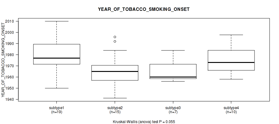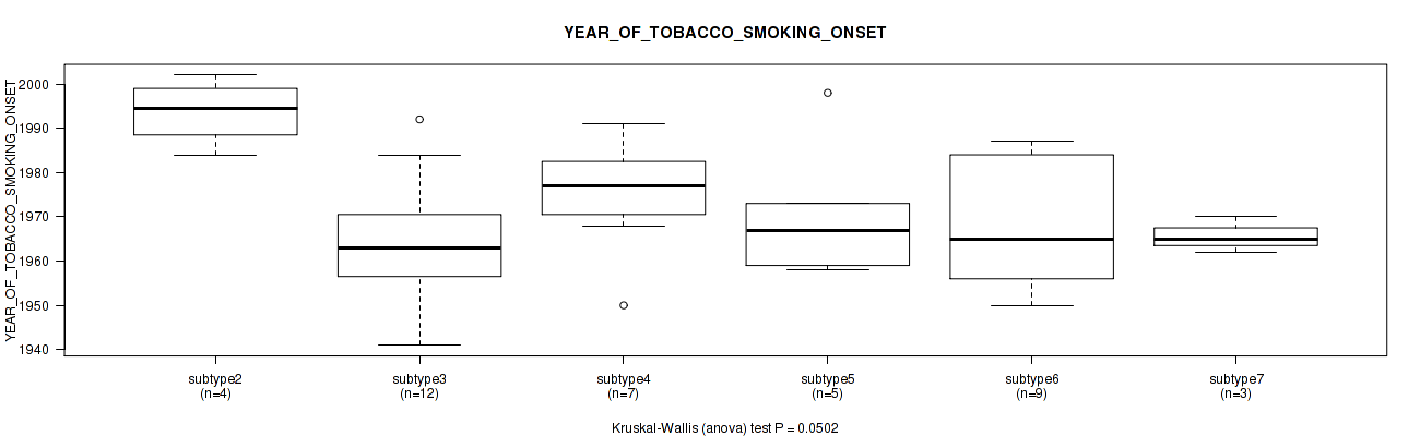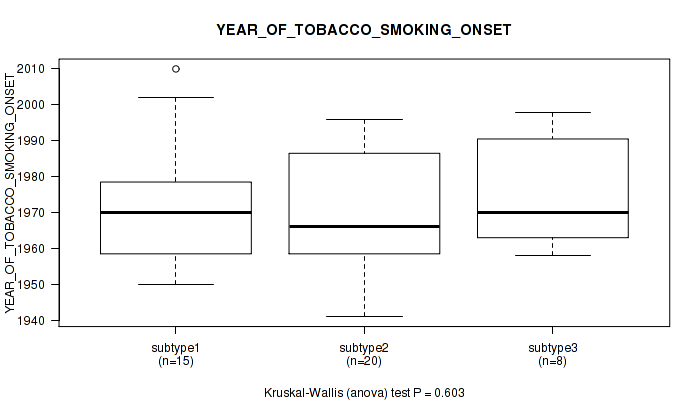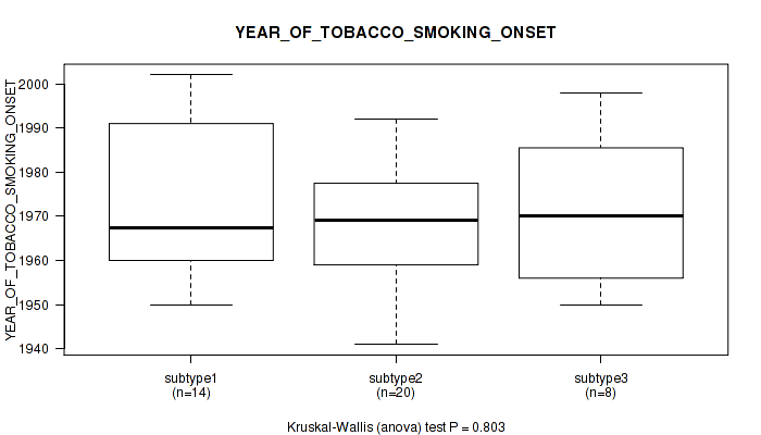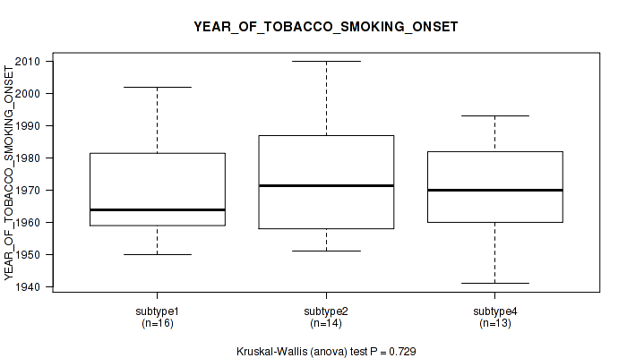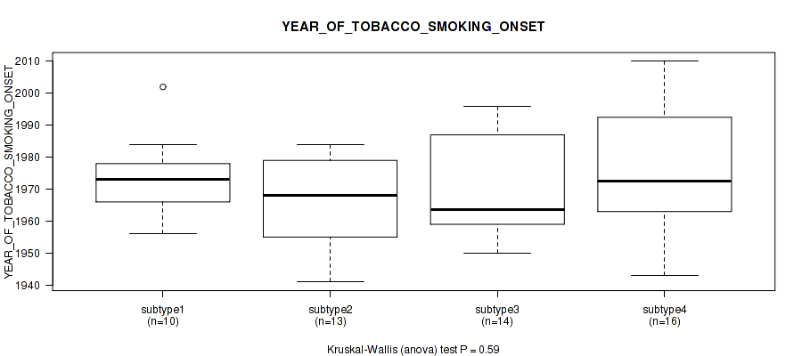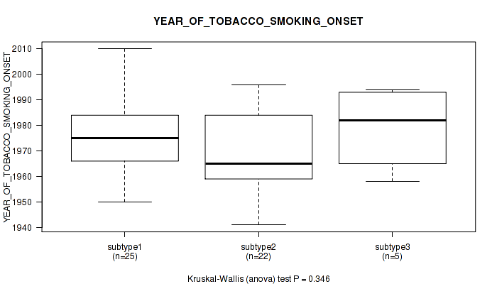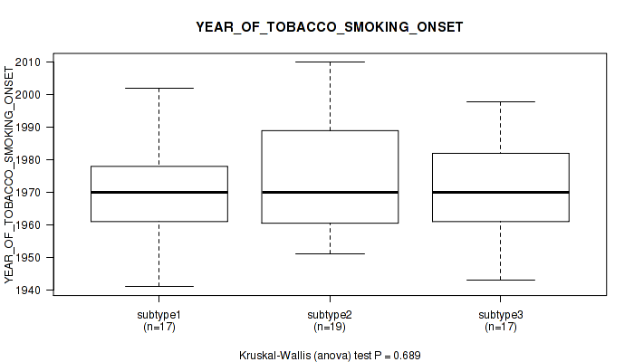 Figure S118. Get High-res Image Clustering Approach #10: 'MIRseq Mature cHierClus subtypes' versus Clinical Feature #10: 'YEAR_OF_TOBACCO_SMOKING_ONSET'