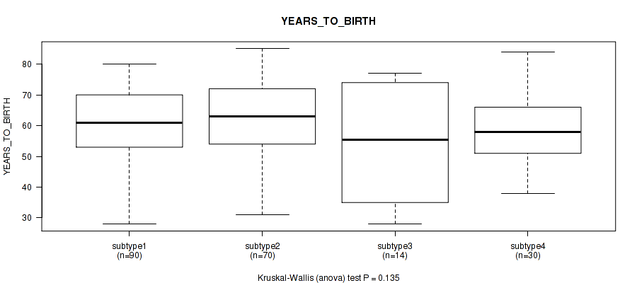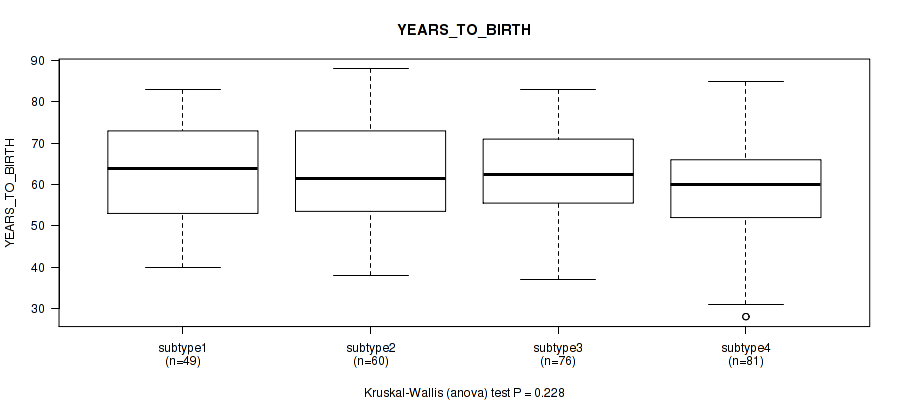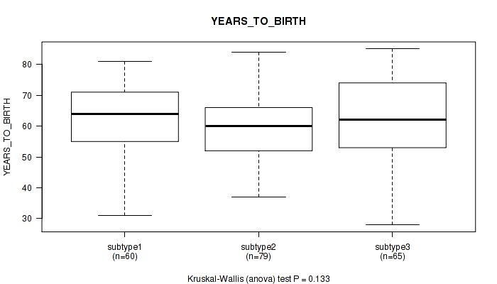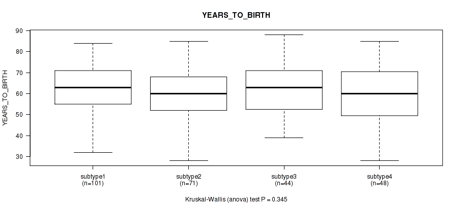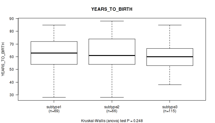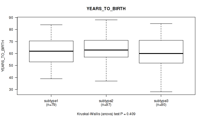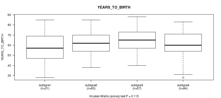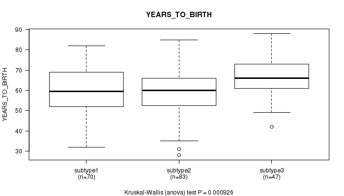 | YEARS TO BIRTH | Kruskal-Wallis (anova) |