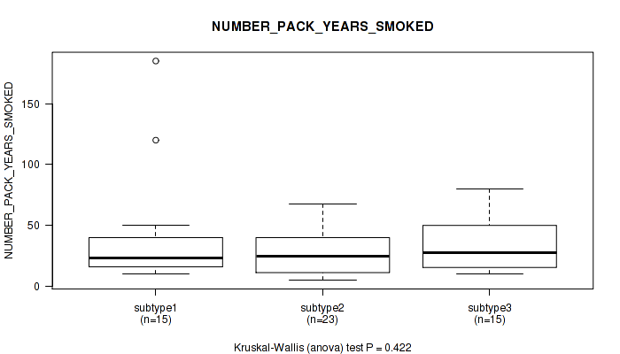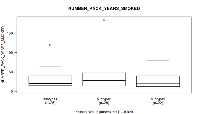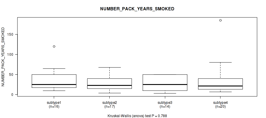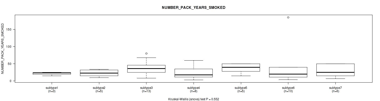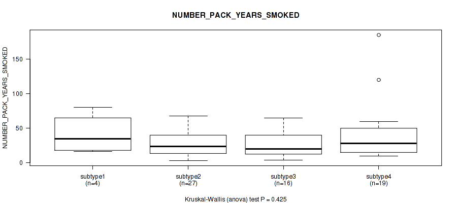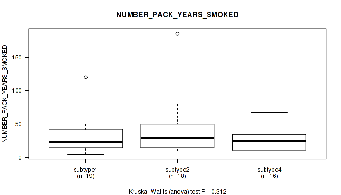 Table S127. Clustering Approach #10: 'MIRseq Mature cHierClus subtypes' versus Clinical Feature #9: 'NUMBER_PACK_YEARS_SMOKED'