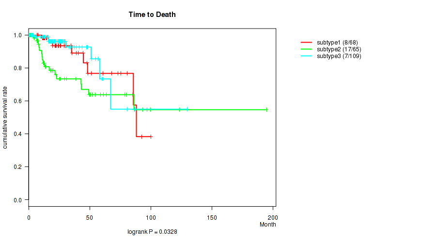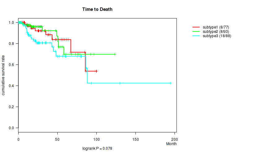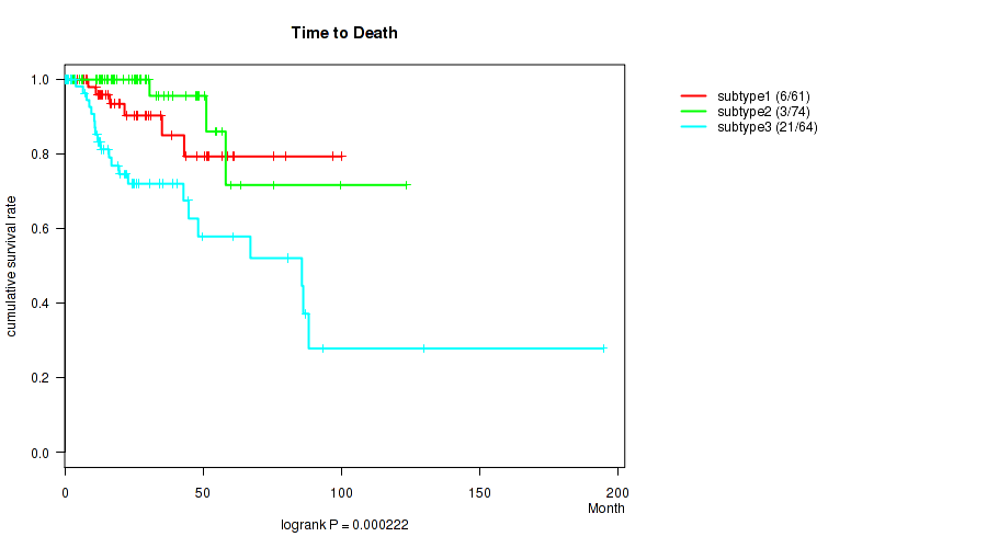 Consensus hierarchical clustering analysis on sequencing-based mRNA expression data identified 3 subtypes that correlate to 'Time to Death', 'NEOPLASM_DISEASESTAGE', 'PATHOLOGY_T_STAGE', 'PATHOLOGY_N_STAGE', 'PATHOLOGY_M_STAGE', and 'GENDER'.