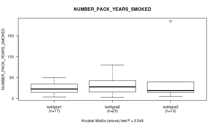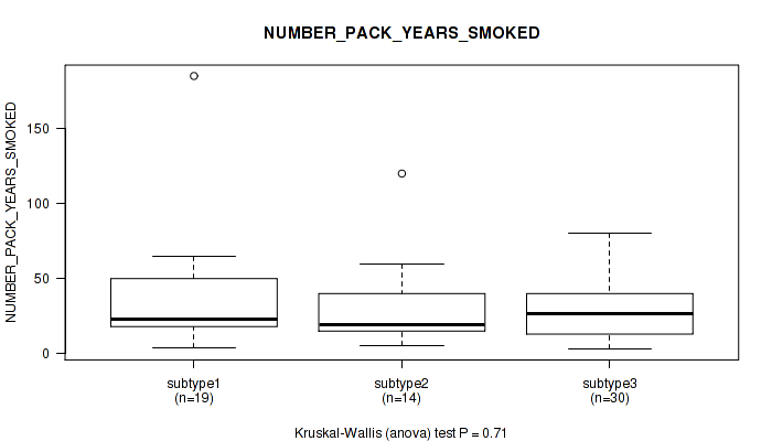 Figure S117. Get High-res Image Clustering Approach #10: 'MIRseq Mature cHierClus subtypes' versus Clinical Feature #9: 'NUMBER_PACK_YEARS_SMOKED'