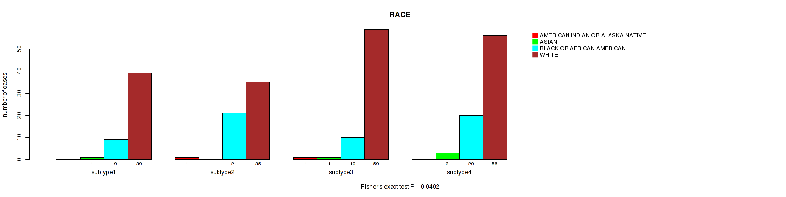 4 subtypes identified in current cancer cohort by 'MIRSEQ CHIERARCHICAL'. These subtypes correlate to 'NEOPLASM_DISEASESTAGE', 'PATHOLOGY_T_STAGE', 'PATHOLOGY_N_STAGE', 'GENDER', and 'RACE'.