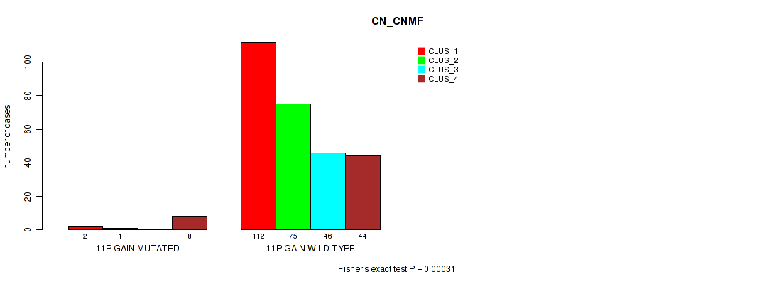 11p gain cnv correlated to 'CN_CNMF', 'METHLYATION_CNMF', 'RPPA_CHIERARCHICAL', and 'MRNASEQ_CHIERARCHICAL'.