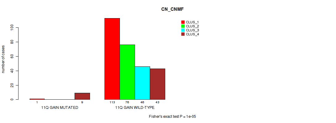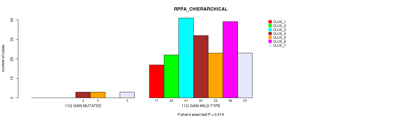 11q gain cnv correlated to 'CN_CNMF', 'METHLYATION_CNMF', 'RPPA_CHIERARCHICAL', 'MRNASEQ_CNMF', and 'MRNASEQ_CHIERARCHICAL'.