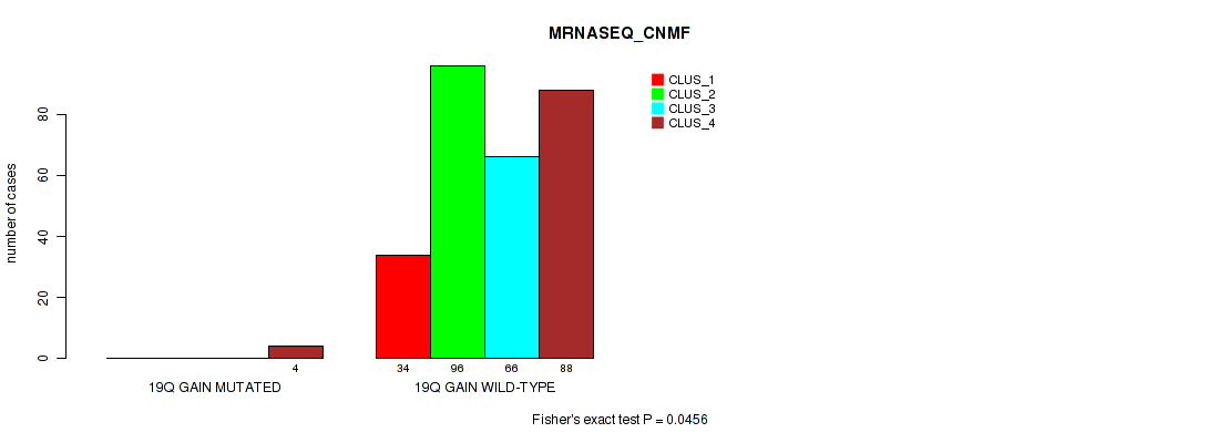 19q gain cnv correlated to 'CN_CNMF', 'MRNASEQ_CNMF', and 'MRNASEQ_CHIERARCHICAL'.