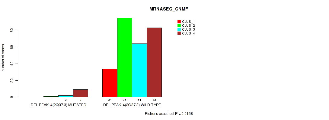 del_4q34.3 cnv correlated to 'CN_CNMF', 'METHLYATION_CNMF', 'RPPA_CHIERARCHICAL', 'MRNASEQ_CNMF', 'MRNASEQ_CHIERARCHICAL', 'MIRSEQ_MATURE_CNMF', and 'MIRSEQ_MATURE_CHIERARCHICAL'.