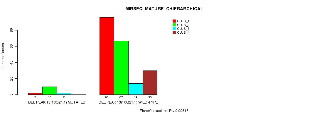 Table S191. Gene #31: 'del_xq28' versus Molecular Subtype #10: 'MIRSEQ_MATURE_CHIERARCHICAL'