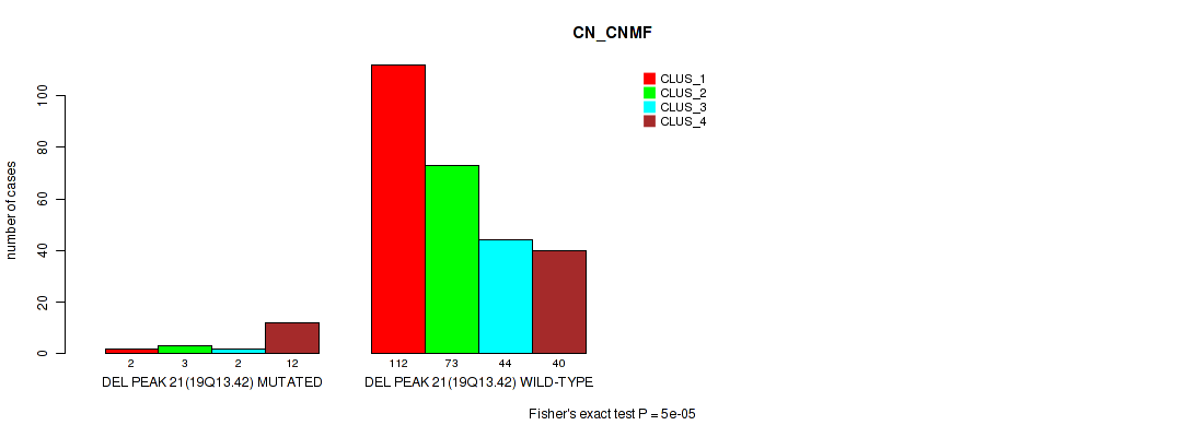 del_19q13.42 cnv correlated to 'CN_CNMF', 'METHLYATION_CNMF', 'RPPA_CHIERARCHICAL', 'MRNASEQ_CNMF', and 'MRNASEQ_CHIERARCHICAL'.