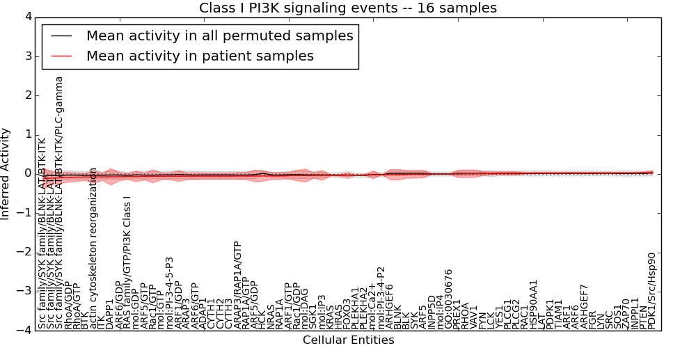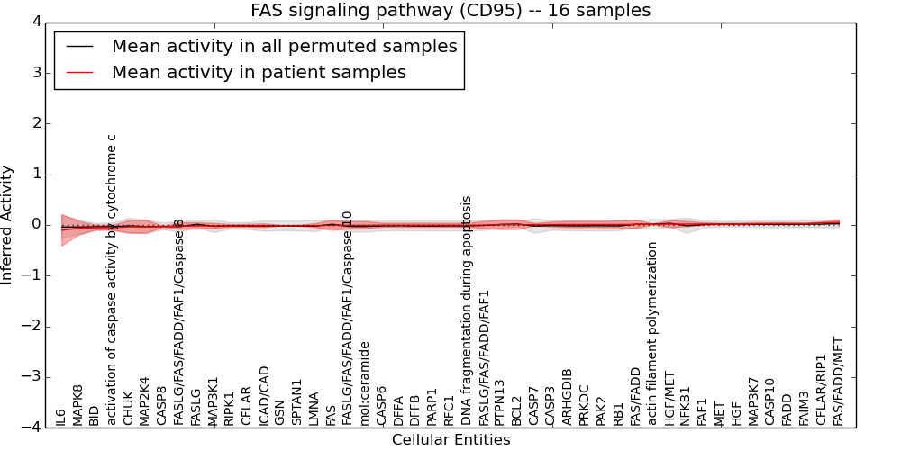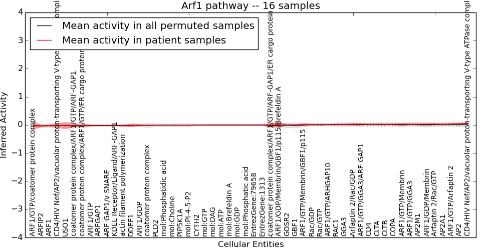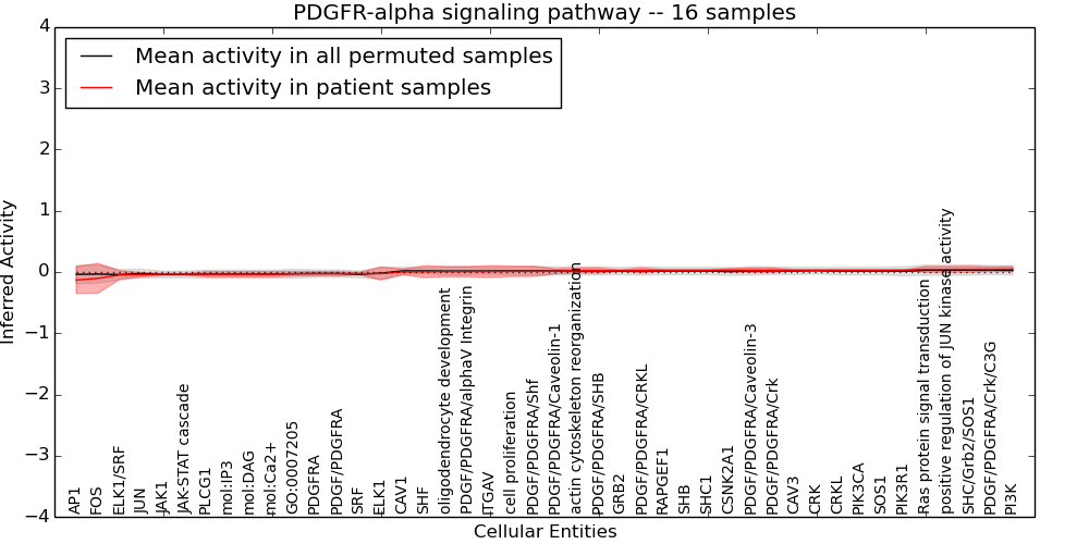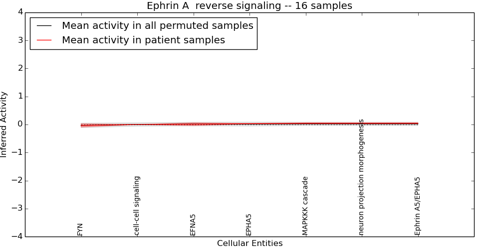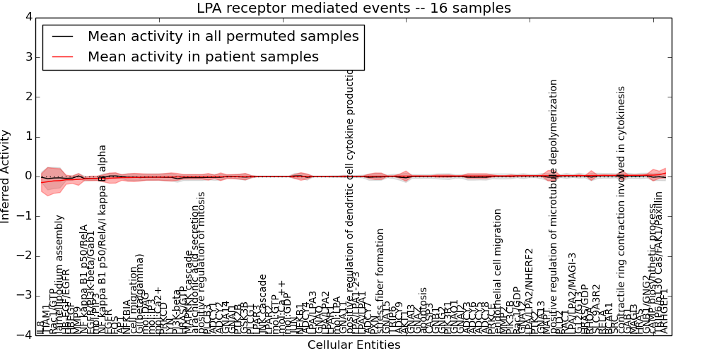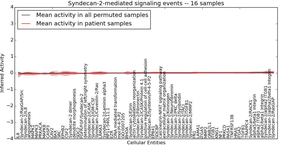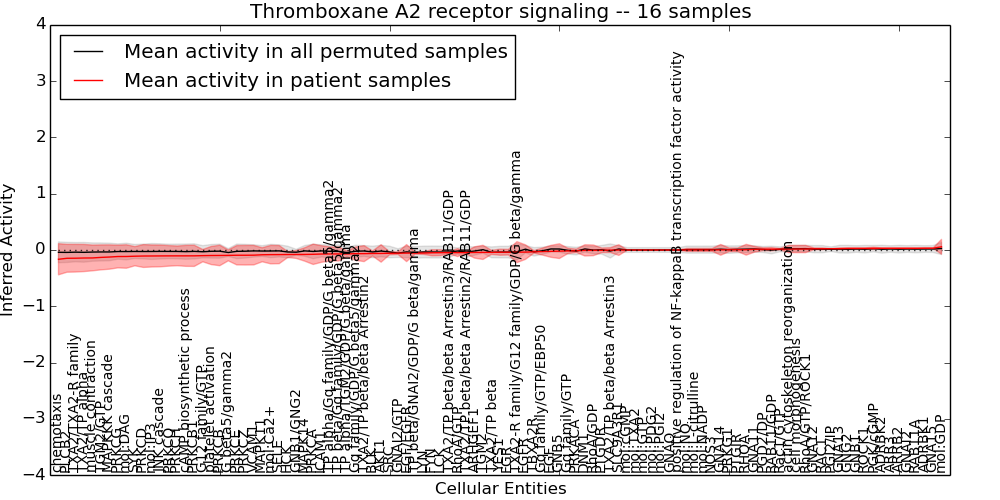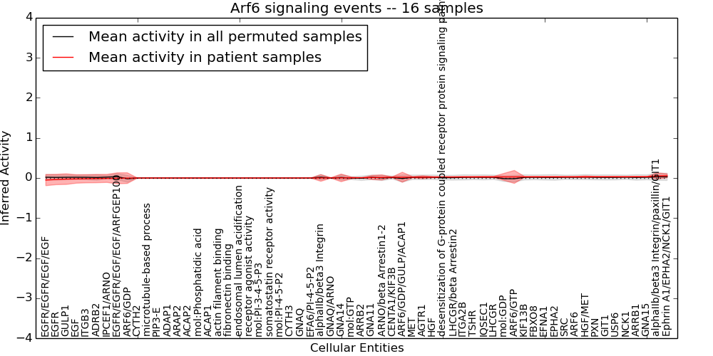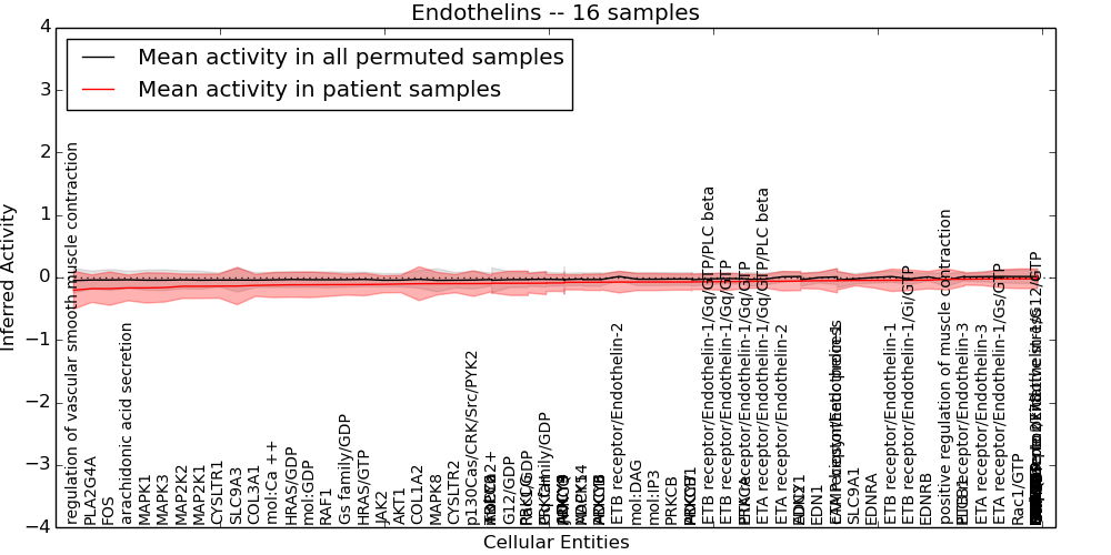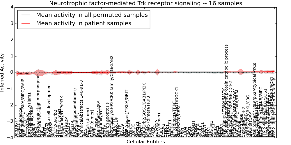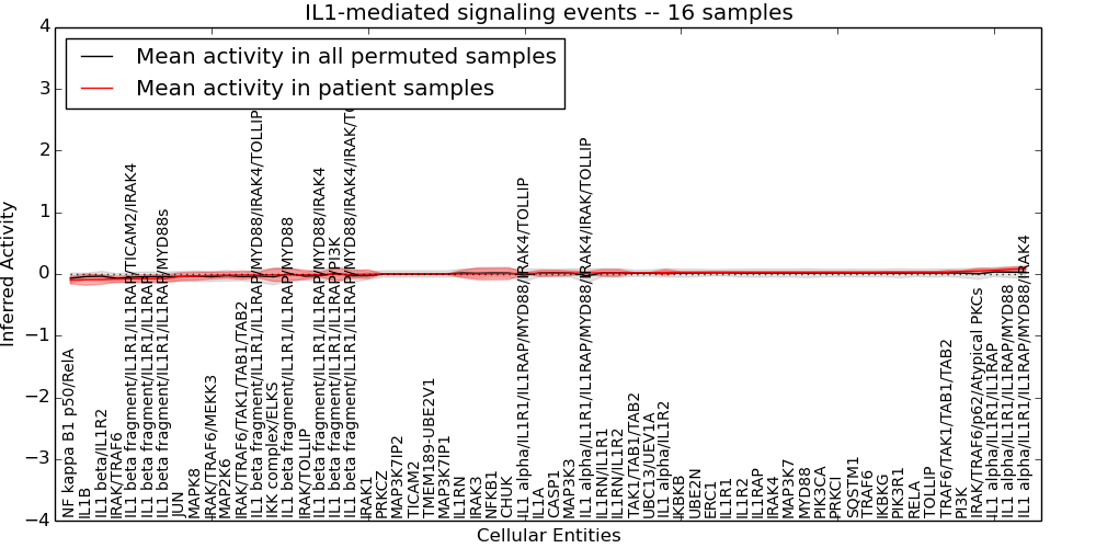 Figure S131. Get High-res Image This plot shows pathway concept perturbations across all samples against a permutation model. The concepts along the x-axis are sorted by lowest to highest mean activity for the real patient samples. Mean inferred activities are plotted along the y-axis as a colored band showing the average level and one standard deviation range. Real samples are shown in red and permuted samples in black.