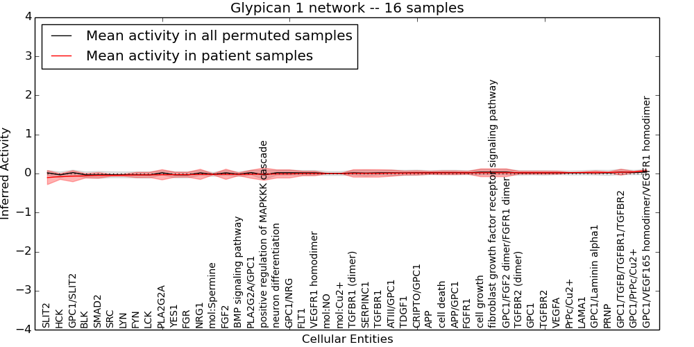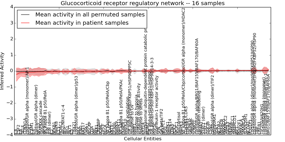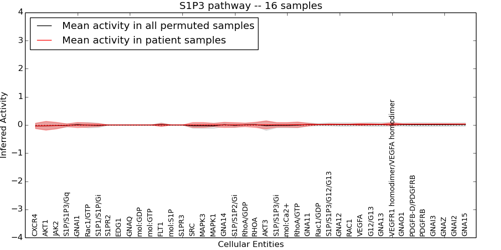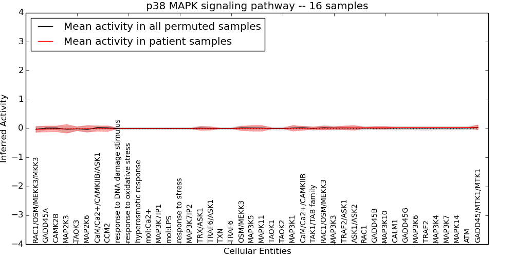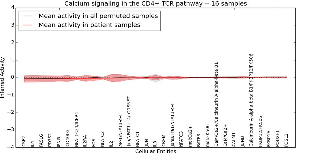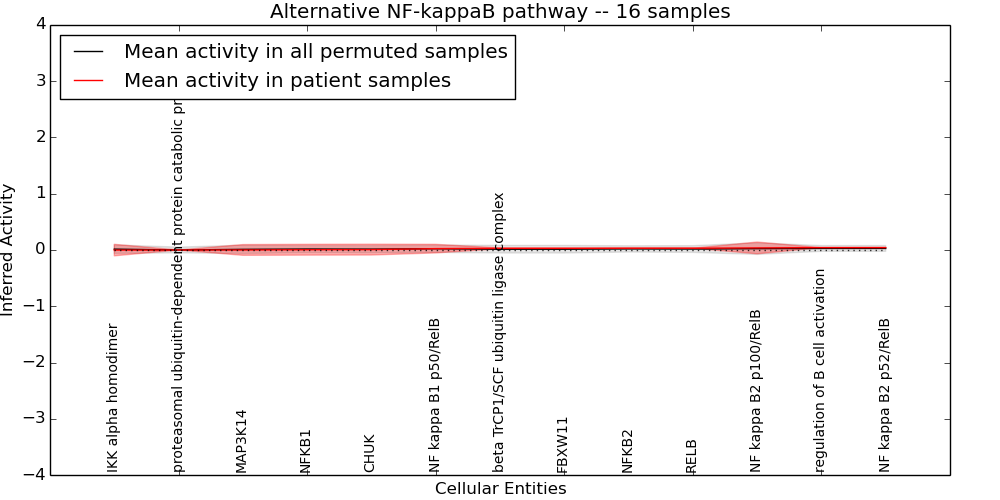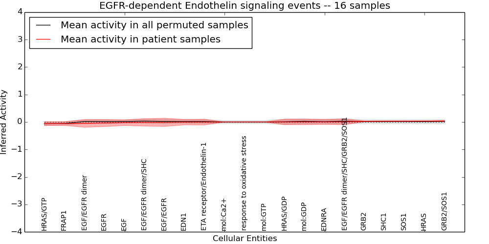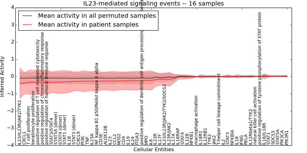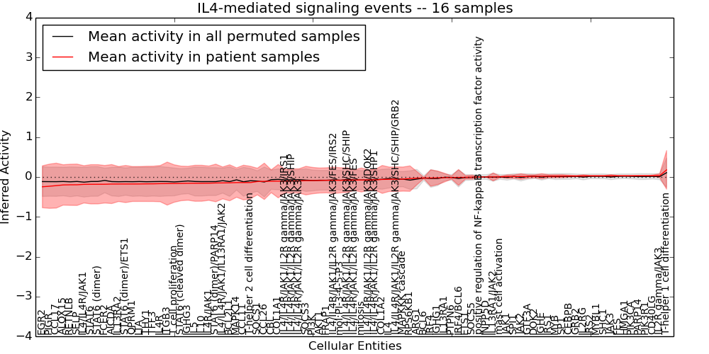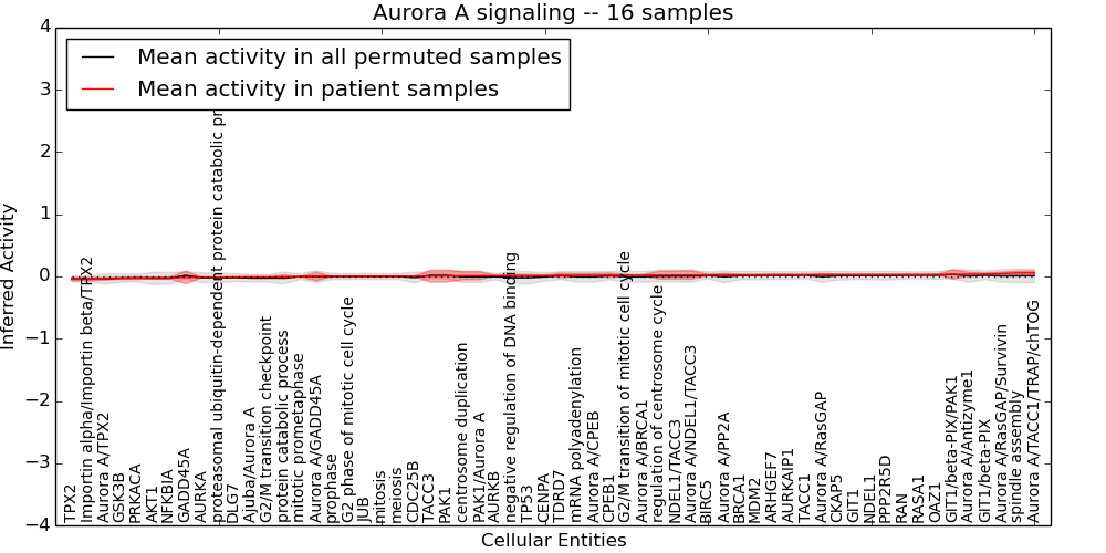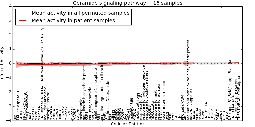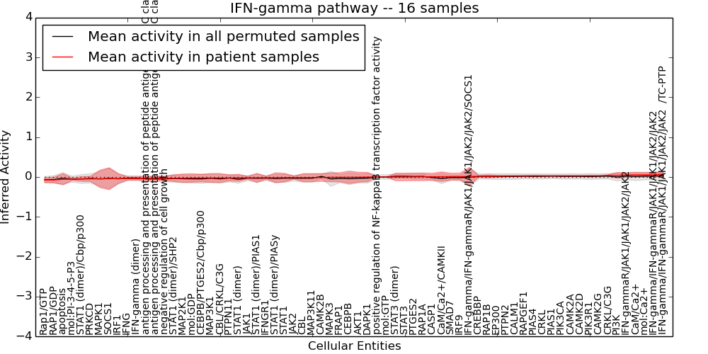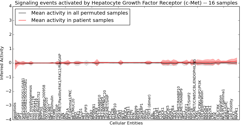 Figure S131. Get High-res Image This plot shows pathway concept perturbations across all samples against a permutation model. The concepts along the x-axis are sorted by lowest to highest mean activity for the real patient samples. Mean inferred activities are plotted along the y-axis as a colored band showing the average level and one standard deviation range. Real samples are shown in red and permuted samples in black.
