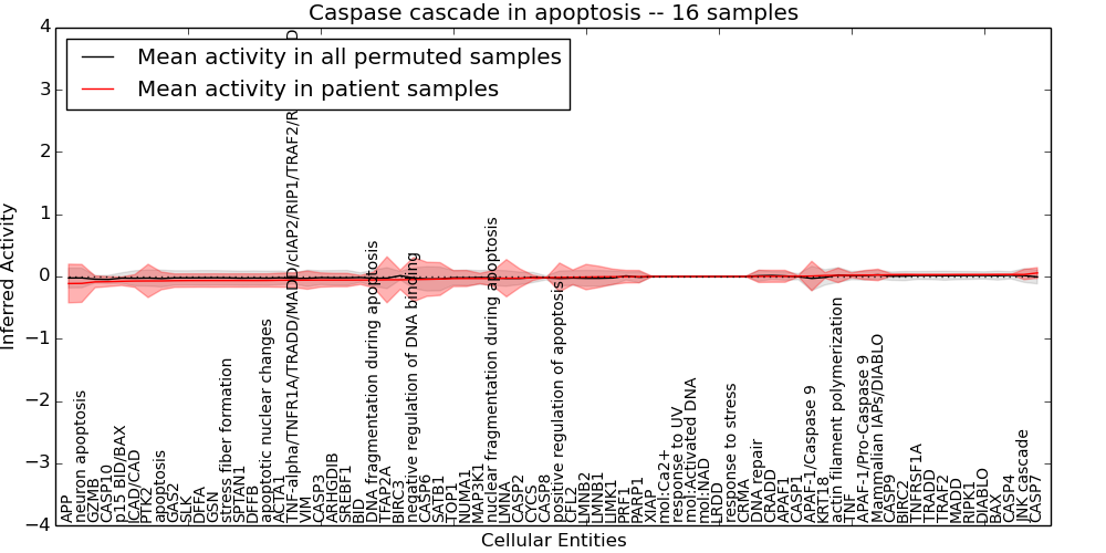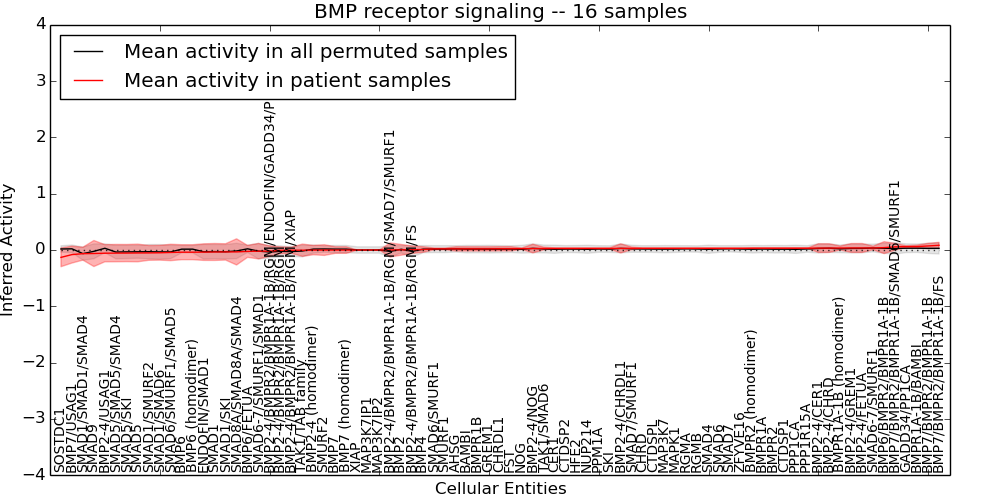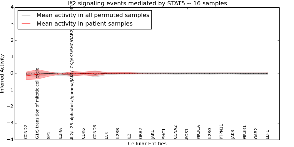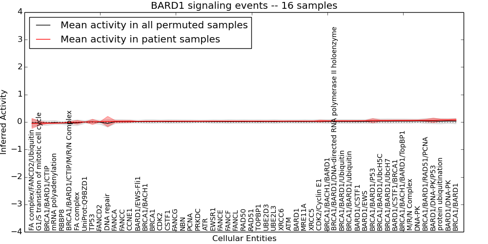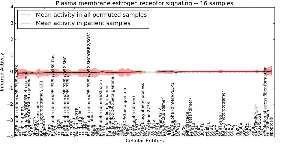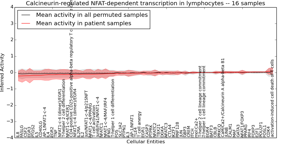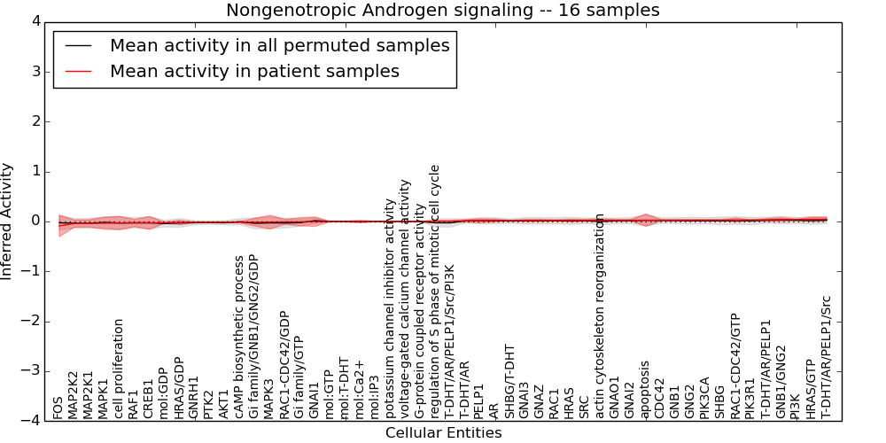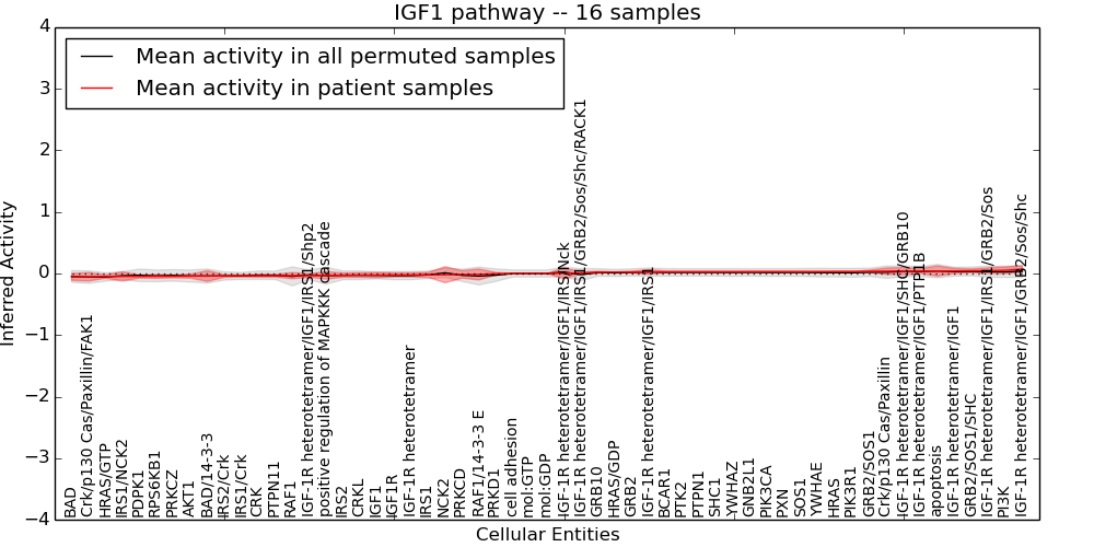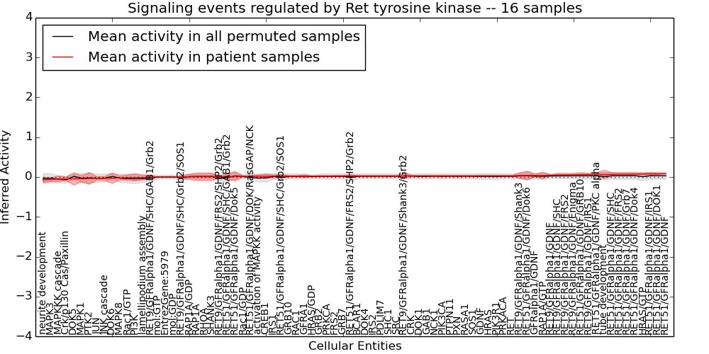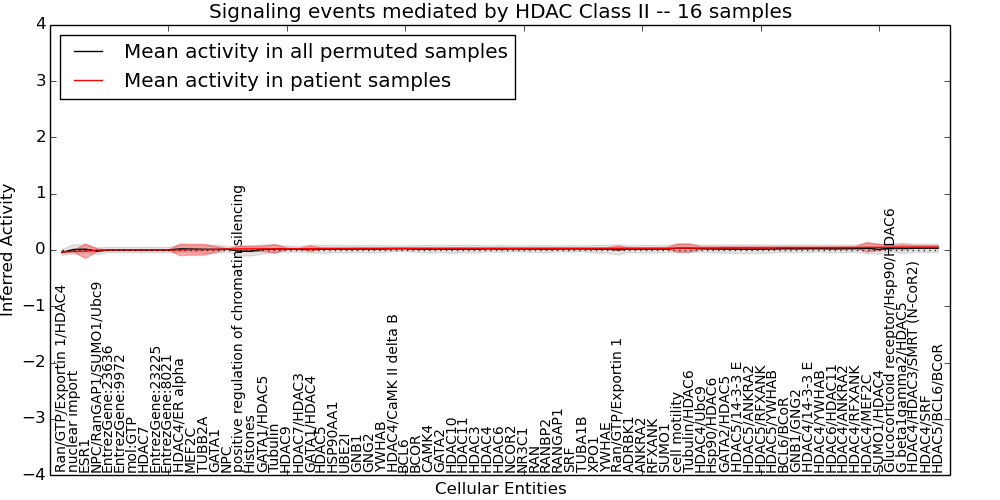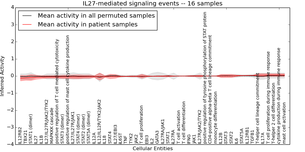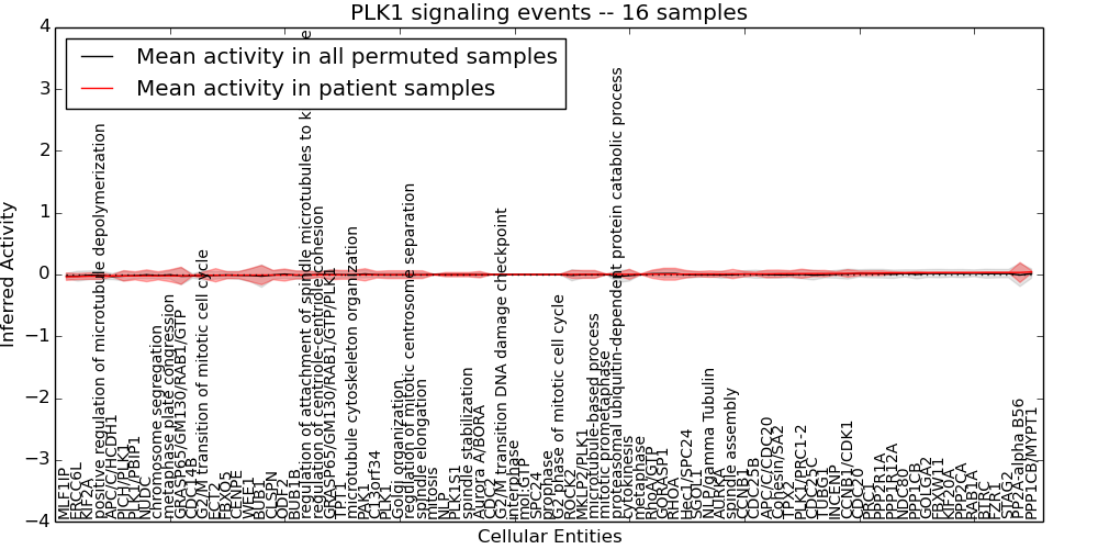 Figure S131. Get High-res Image This plot shows pathway concept perturbations across all samples against a permutation model. The concepts along the x-axis are sorted by lowest to highest mean activity for the real patient samples. Mean inferred activities are plotted along the y-axis as a colored band showing the average level and one standard deviation range. Real samples are shown in red and permuted samples in black.