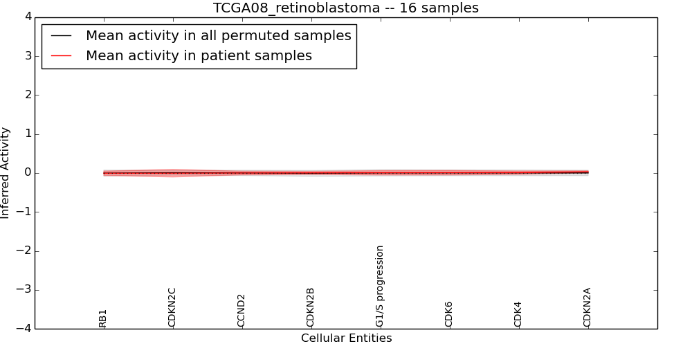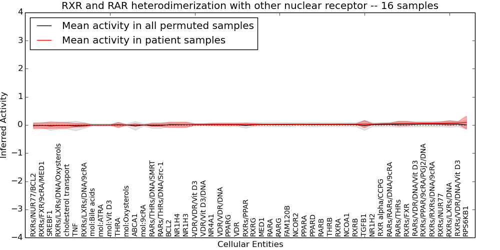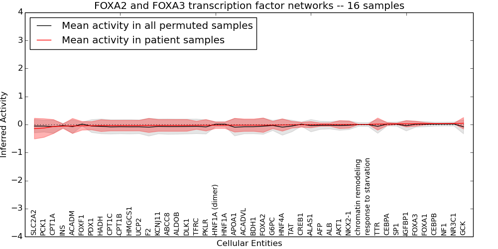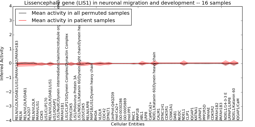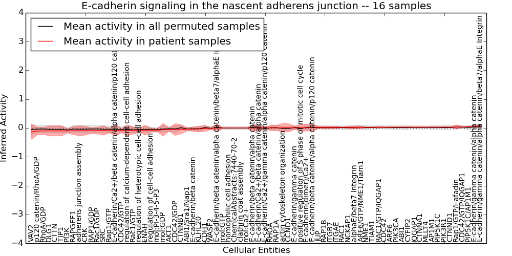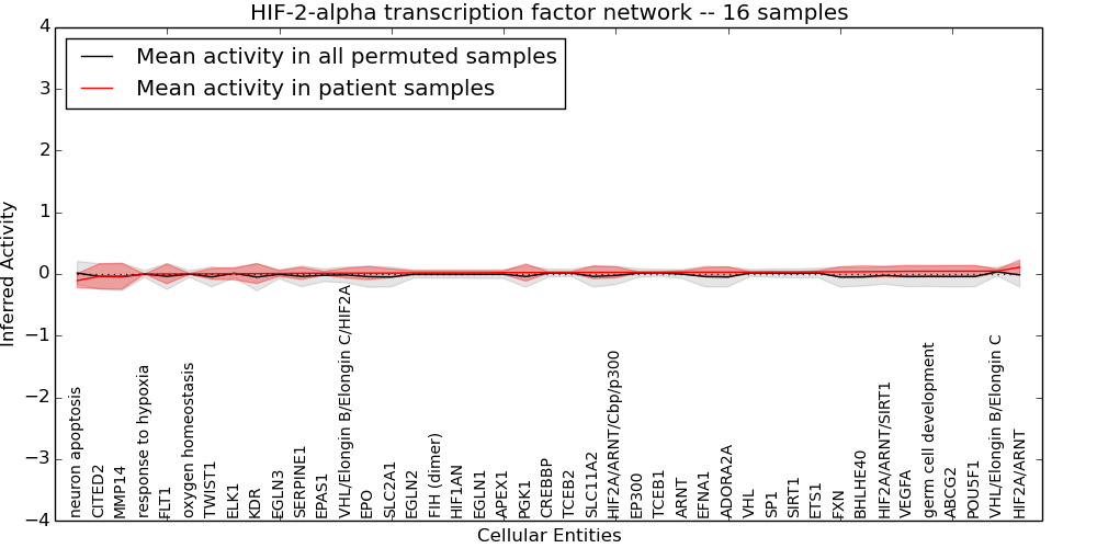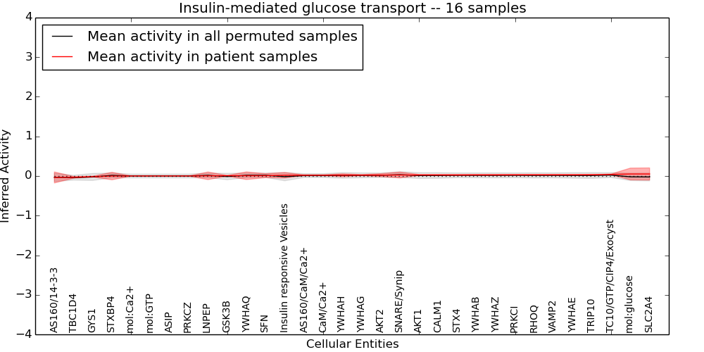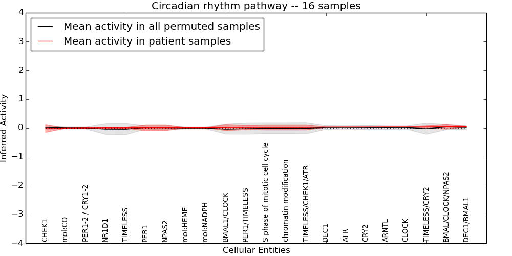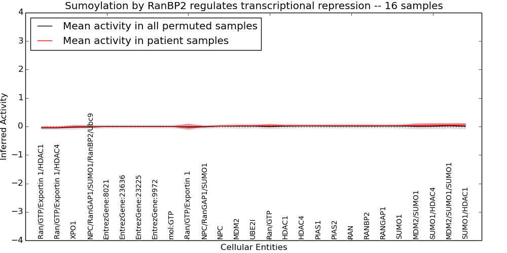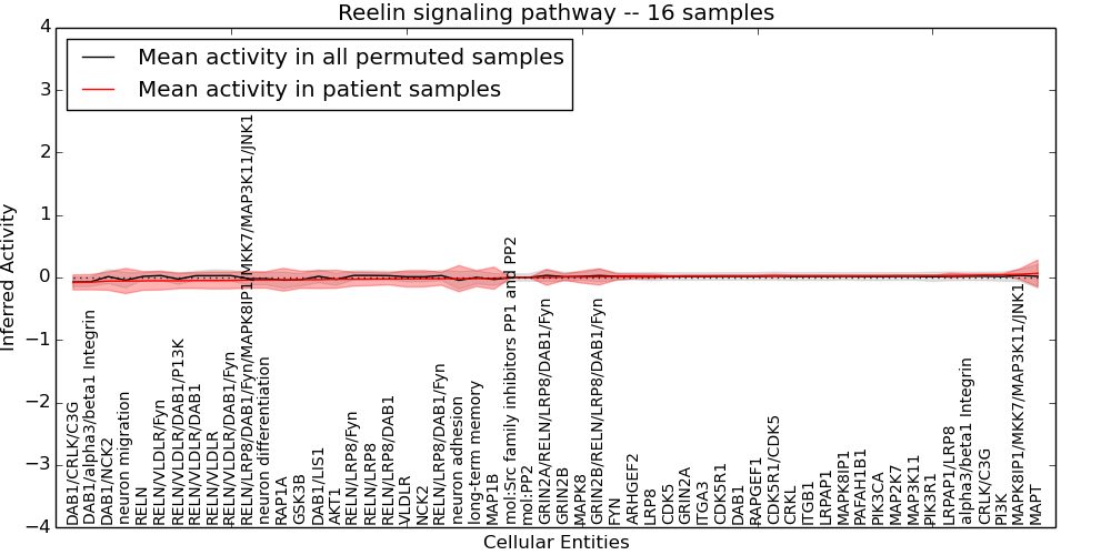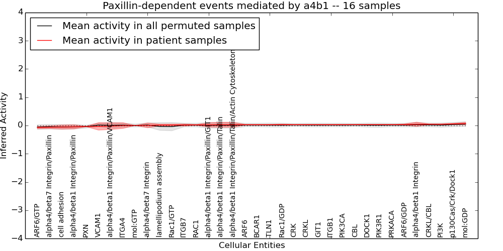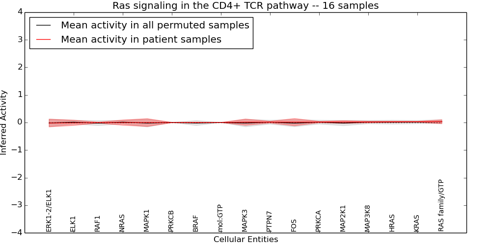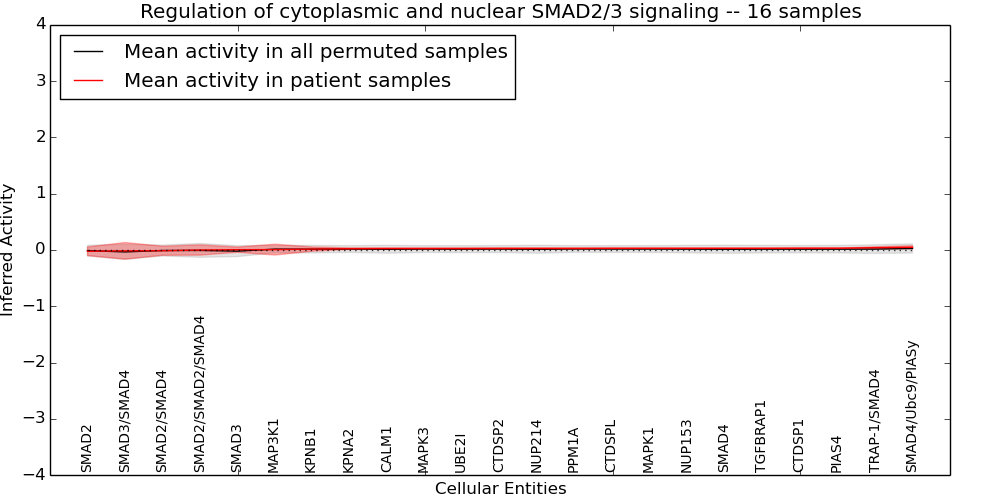Figure S131. Get High-res Image This plot shows pathway concept perturbations across all samples against a permutation model. The concepts along the x-axis are sorted by lowest to highest mean activity for the real patient samples. Mean inferred activities are plotted along the y-axis as a colored band showing the average level and one standard deviation range. Real samples are shown in red and permuted samples in black.