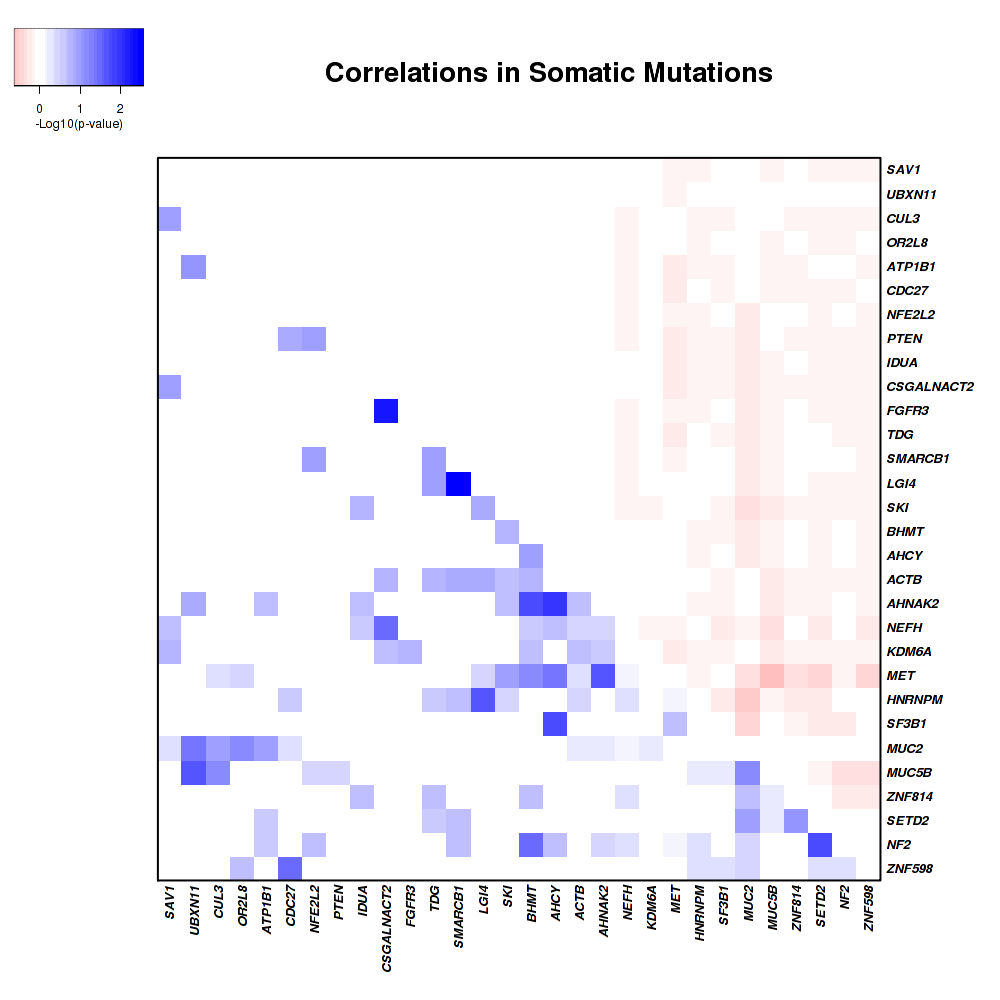 Figure 3. Get High-res Image Co-occurring and mutually-exclusive pairs for significantly mutated genes. Blue means two events are co-occurring and red means two events are mutually-exclusive.
