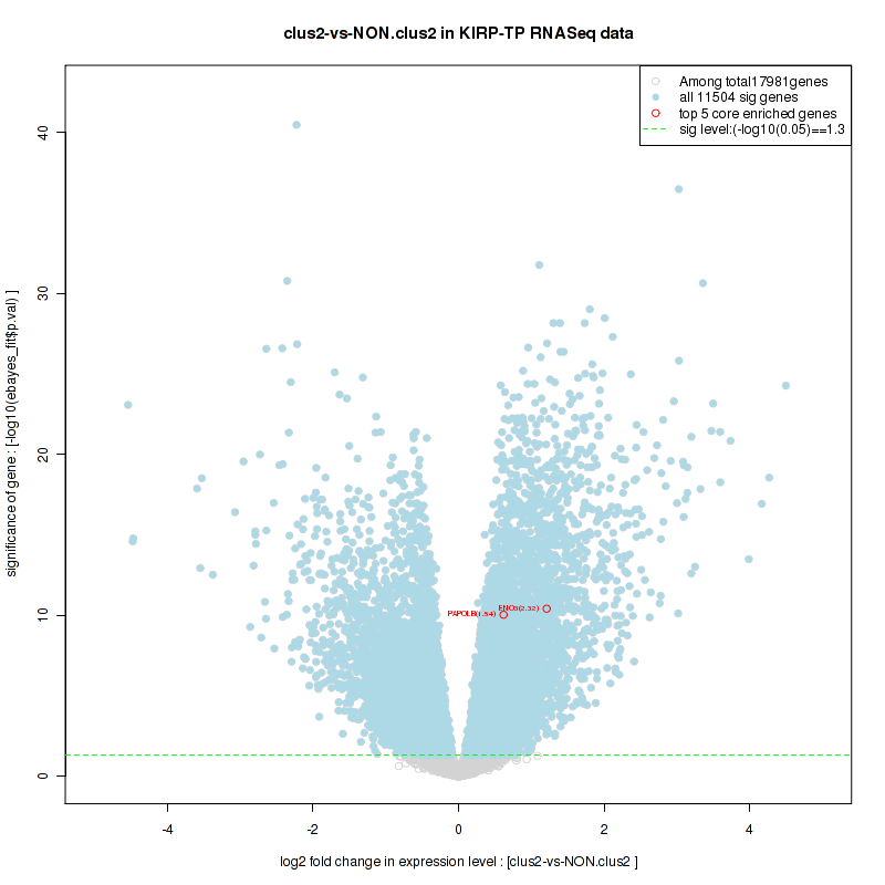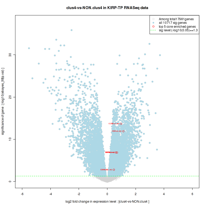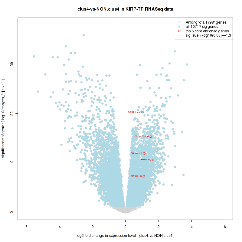 Figure S78. Get High-res Image For the top 5 core enriched genes in the pathway: KEGG CELL CYCLE, this volcano plot shows how much they are up/down-regulated and significant. The significance was calculated by empirical bayesian fit