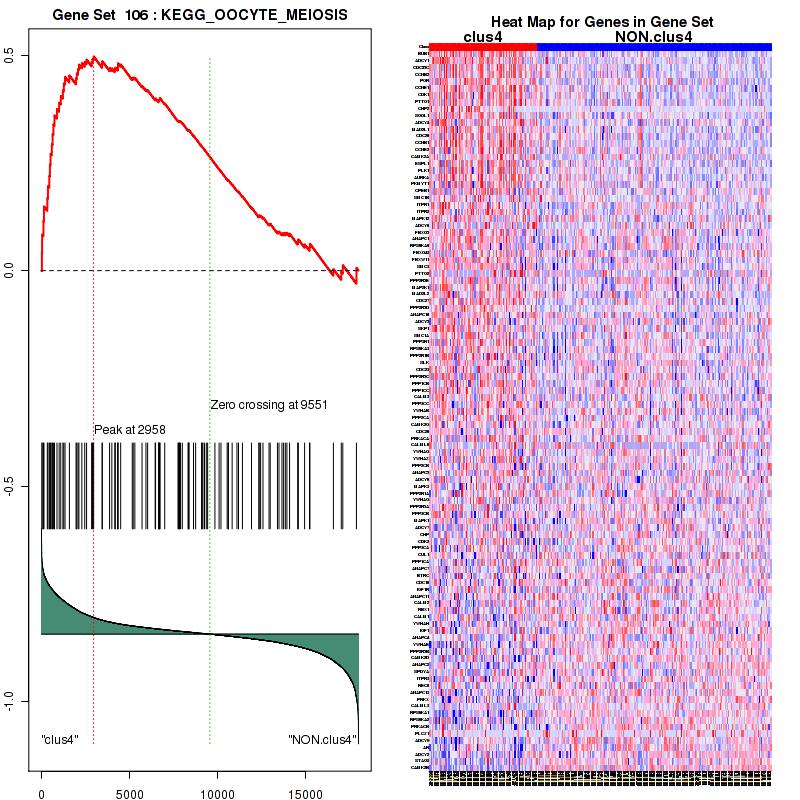 Figure S79. Get High-res Image This plot shows mRNAseq_cNMF expression data heatmap (on the left) a RunningEnrichmentScore(RES) plot (on the top right) and a Signal2Noise(S2N) plot (on the bottom right) of genes in the pathway: KEGG OOCYTE MEIOSIS.