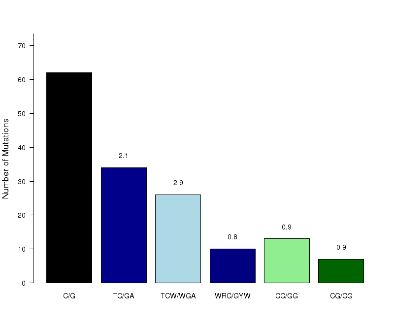 Figure 8.  Get High-res Image The number of mutations categorized into three possible types of substitutions at the tCw motif (complementary mutations included) within C- or G-coordinated clusters. Numbers are calculated using the “Totals” row in the corresponding columns of the “*_sorted_sum_G_C_clusters.txt” file. Mutations caused by cytidine deamination in stretches of ssDNA caused by APOBEC mutagenesis are expected to be predominantly C-->T or C-->G with very few C-->A. Base substitution categories are shown within TCW context.