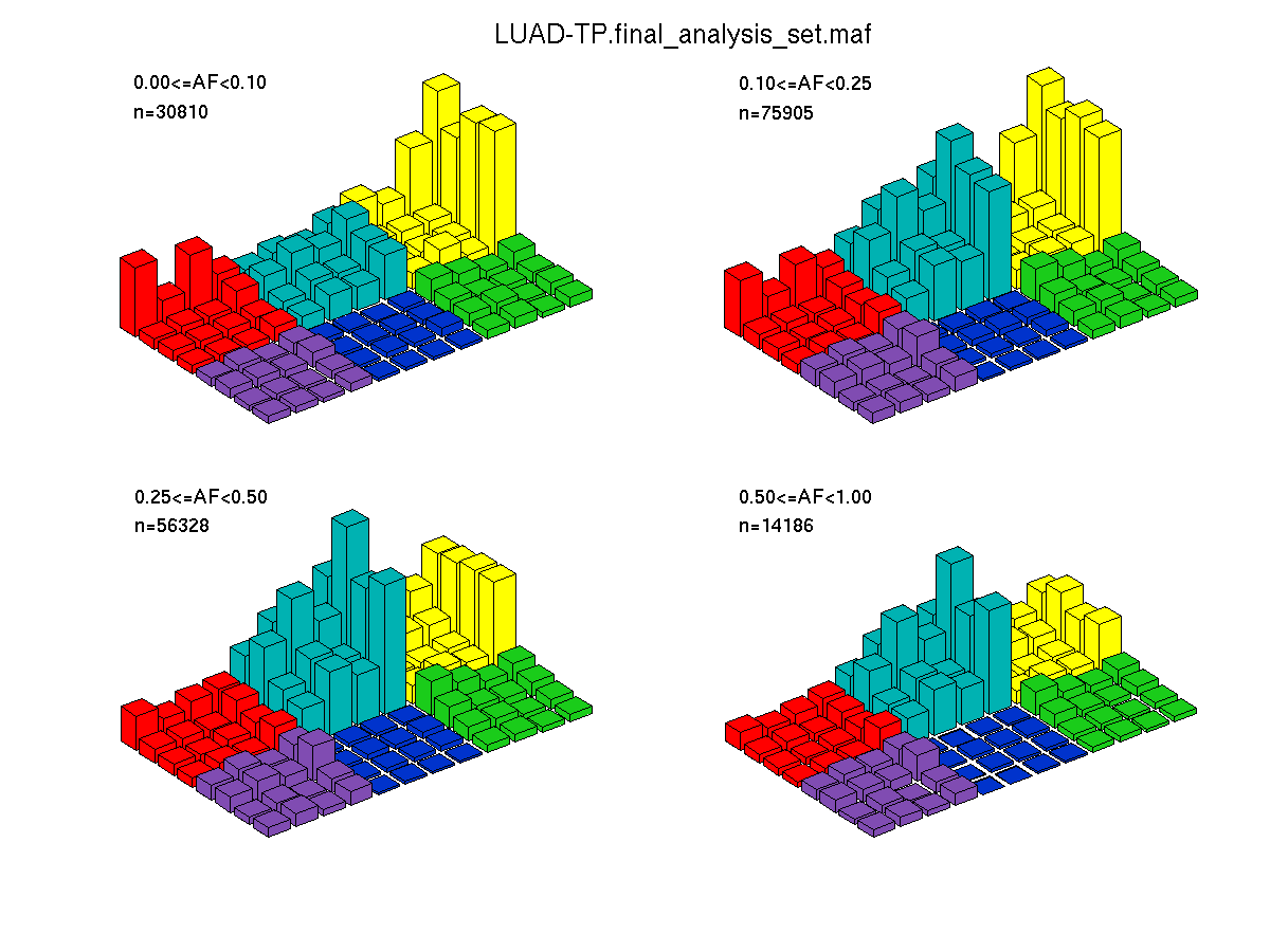 Figure 4. Get High-res Image SNV Mutation rate lego plots for 4 slices of mutation allele fraction (0<=AF<0.1, 0.1<=AF<0.25, 0.25<=AF<0.5, & 0.5<=AF) . The color code and three-base context legends are the same as the previous figure. If this figure is blank, not enough information was provided in the MAF to generate it.