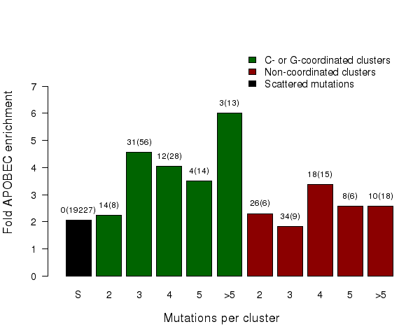 Fold enrichment of the APOBEC mutation signature in clusters of different sizes of two categories – C- or G-coordinated or non-coordinated as well as in non-clustered (scattered) mutations. Smaller clusters usually show less enrichment because they have a higher chance to be formed by random mutations that occurred in close vicinity to each other. Values above the bars display the total number of mutation clusters in each class and in parentheses the total numbers of APOBEC signature mutations in a category. Values for fold enrichment as well as mutation and mutation cluster counts are taken from the following output files which can be downloaded from firehose_get (https://confluence.broadinstitute.org/display/GDAC/Download):