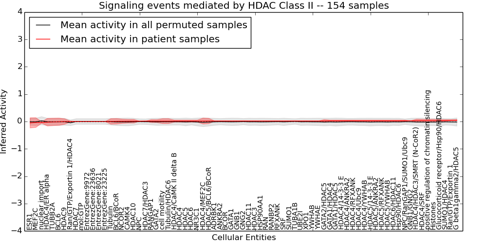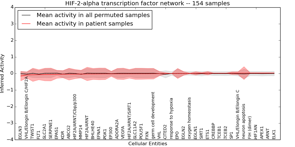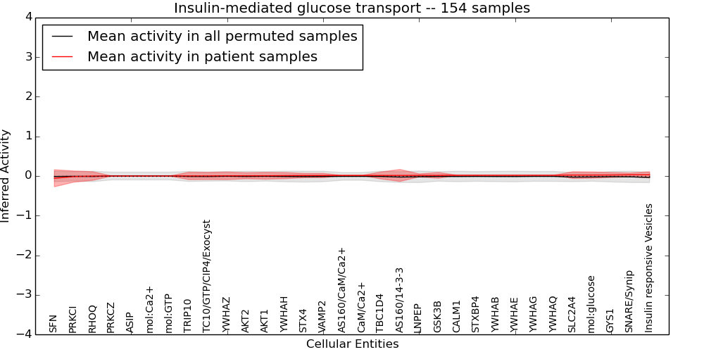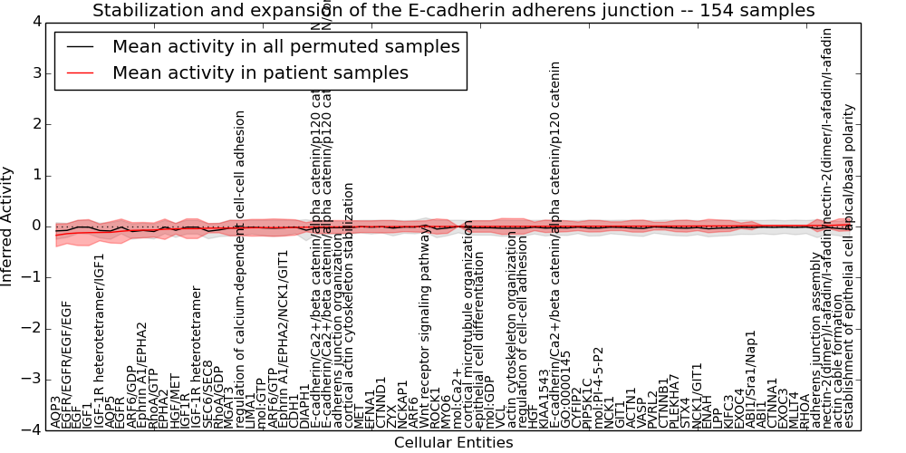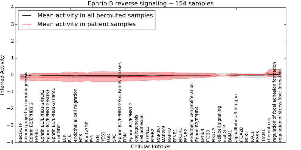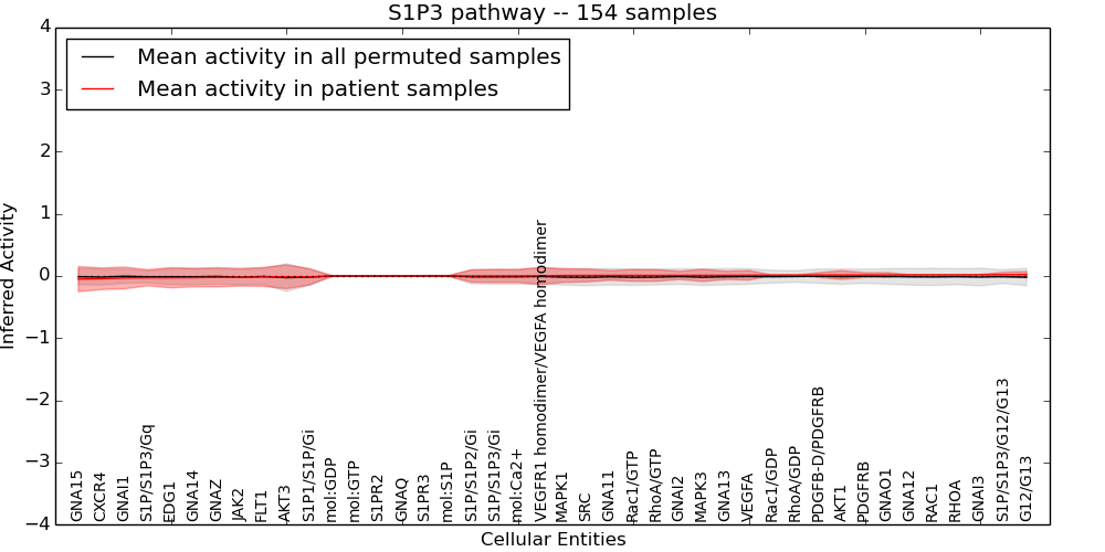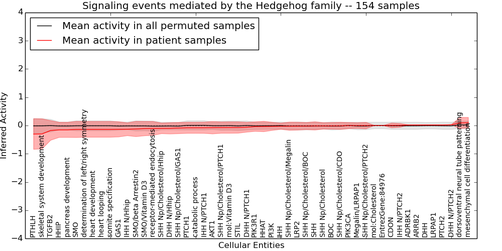 Figure S131. Get High-res Image This plot shows pathway concept perturbations across all samples against a permutation model. The concepts along the x-axis are sorted by lowest to highest mean activity for the real patient samples. Mean inferred activities are plotted along the y-axis as a colored band showing the average level and one standard deviation range. Real samples are shown in red and permuted samples in black.