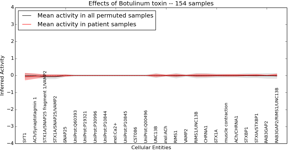 Figure S130. Get High-res Image This plot shows pathway concept perturbations across all samples against a permutation model. The concepts along the x-axis are sorted by lowest to highest mean activity for the real patient samples. Mean inferred activities are plotted along the y-axis as a colored band showing the average level and one standard deviation range. Real samples are shown in red and permuted samples in black.