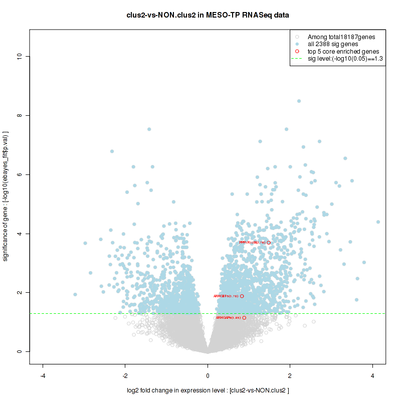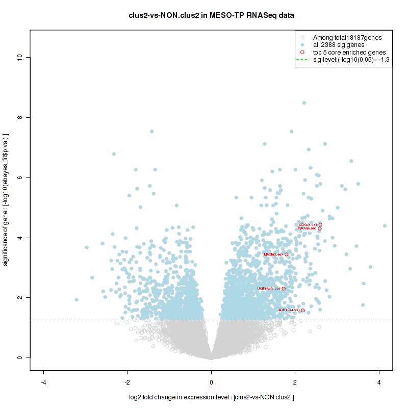 Figure S2.  Get High-res Image For the top 5 core enriched genes in the pathway: BIOCARTA DEATH PATHWAY, this volcano plot shows how much they are up/down-regulated and significant. The significance was calculated by empirical bayesian fit