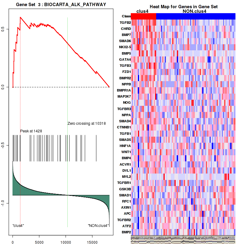 • Top enriched gene sets are BIOCARTA ALK PATHWAY, BIOCARTA G1 PATHWAY, BIOCARTA WNT PATHWAY, KEGG PURINE METABOLISM, KEGG GLYCOSPHINGOLIPID BIOSYNTHESIS LACTO AND NEOLACTO SERIES, KEGG CALCIUM SIGNALING PATHWAY, KEGG OOCYTE MEIOSIS, KEGG VASCULAR SMOOTH MUSCLE CONTRACTION, KEGG WNT SIGNALING PATHWAY, KEGG NOTCH SIGNALING PATHWAY