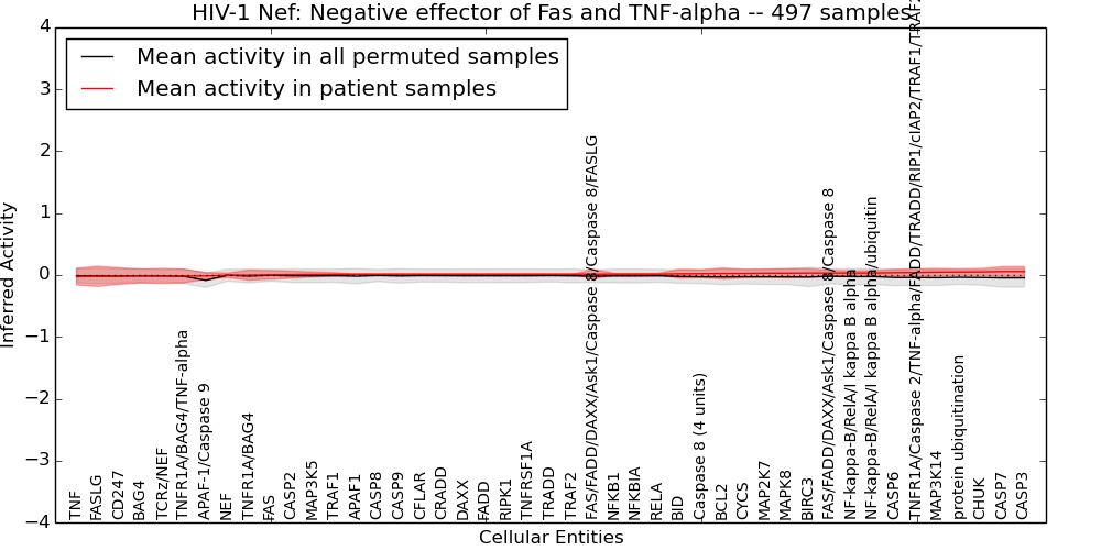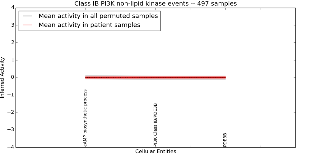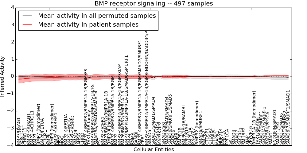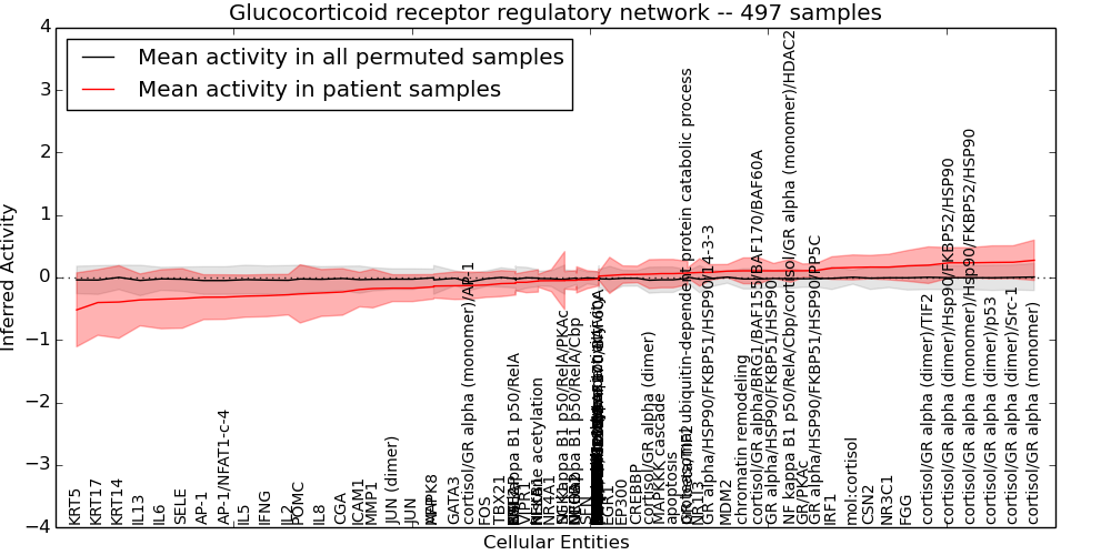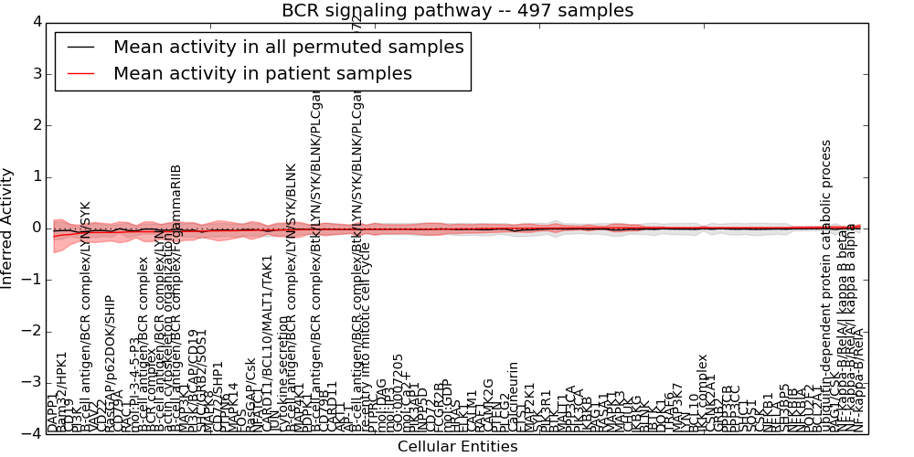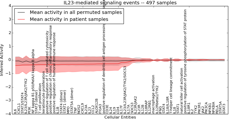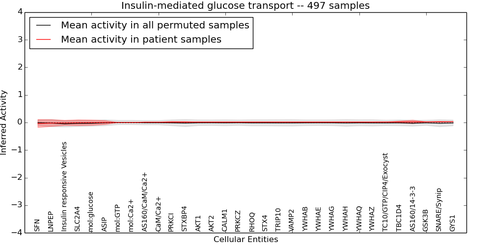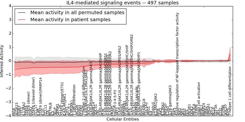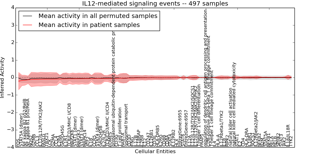 Figure S128. Get High-res Image This plot shows pathway concept perturbations across all samples against a permutation model. The concepts along the x-axis are sorted by lowest to highest mean activity for the real patient samples. Mean inferred activities are plotted along the y-axis as a colored band showing the average level and one standard deviation range. Real samples are shown in red and permuted samples in black.