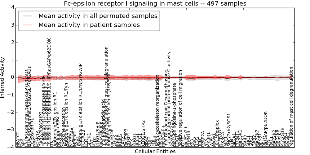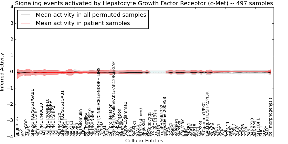 Figure S131. Get High-res Image This plot shows pathway concept perturbations across all samples against a permutation model. The concepts along the x-axis are sorted by lowest to highest mean activity for the real patient samples. Mean inferred activities are plotted along the y-axis as a colored band showing the average level and one standard deviation range. Real samples are shown in red and permuted samples in black.