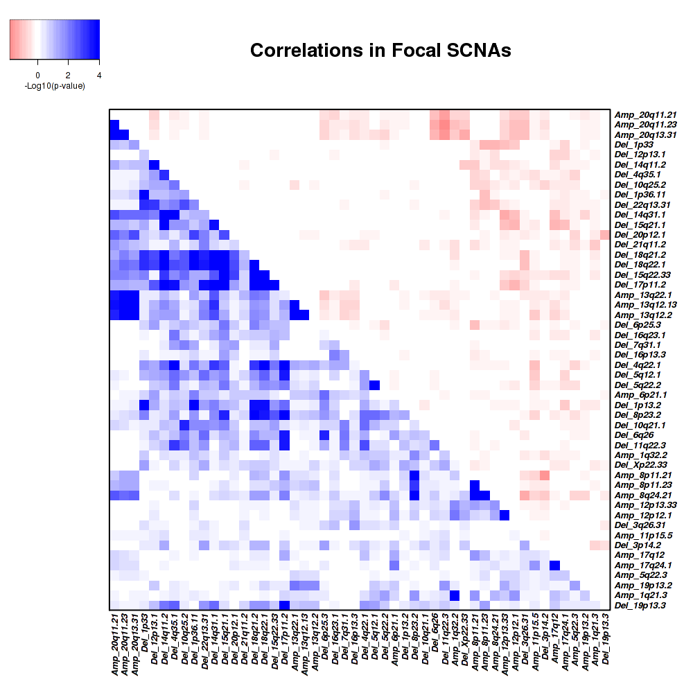 Figure 2. Get High-res Image Co-occurring and mutually-exclusive pairs for copy number variations of focal events. Blue means two events are co-occurring and red means two events are mutually-exclusive.