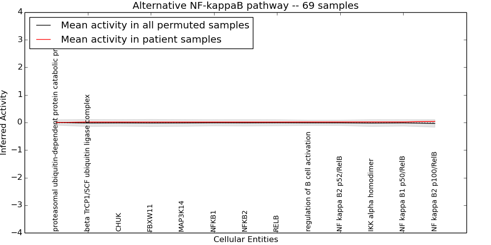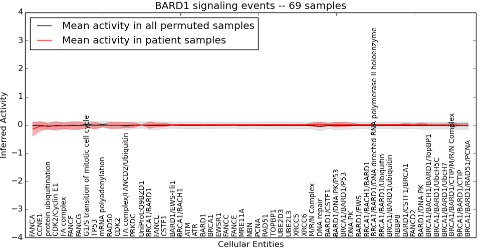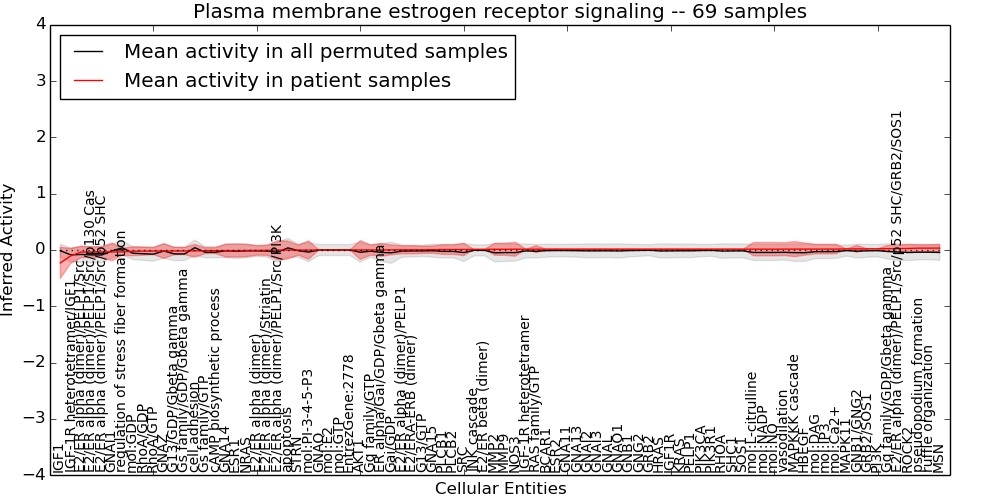 Figure S131.  Get High-res Image This plot shows pathway concept perturbations across all samples against a permutation model. The concepts along the x-axis are sorted by lowest to highest mean activity for the real patient samples. Mean inferred activities are plotted along the y-axis as a colored band showing the average level and one standard deviation range. Real samples are shown in red and permuted samples in black.