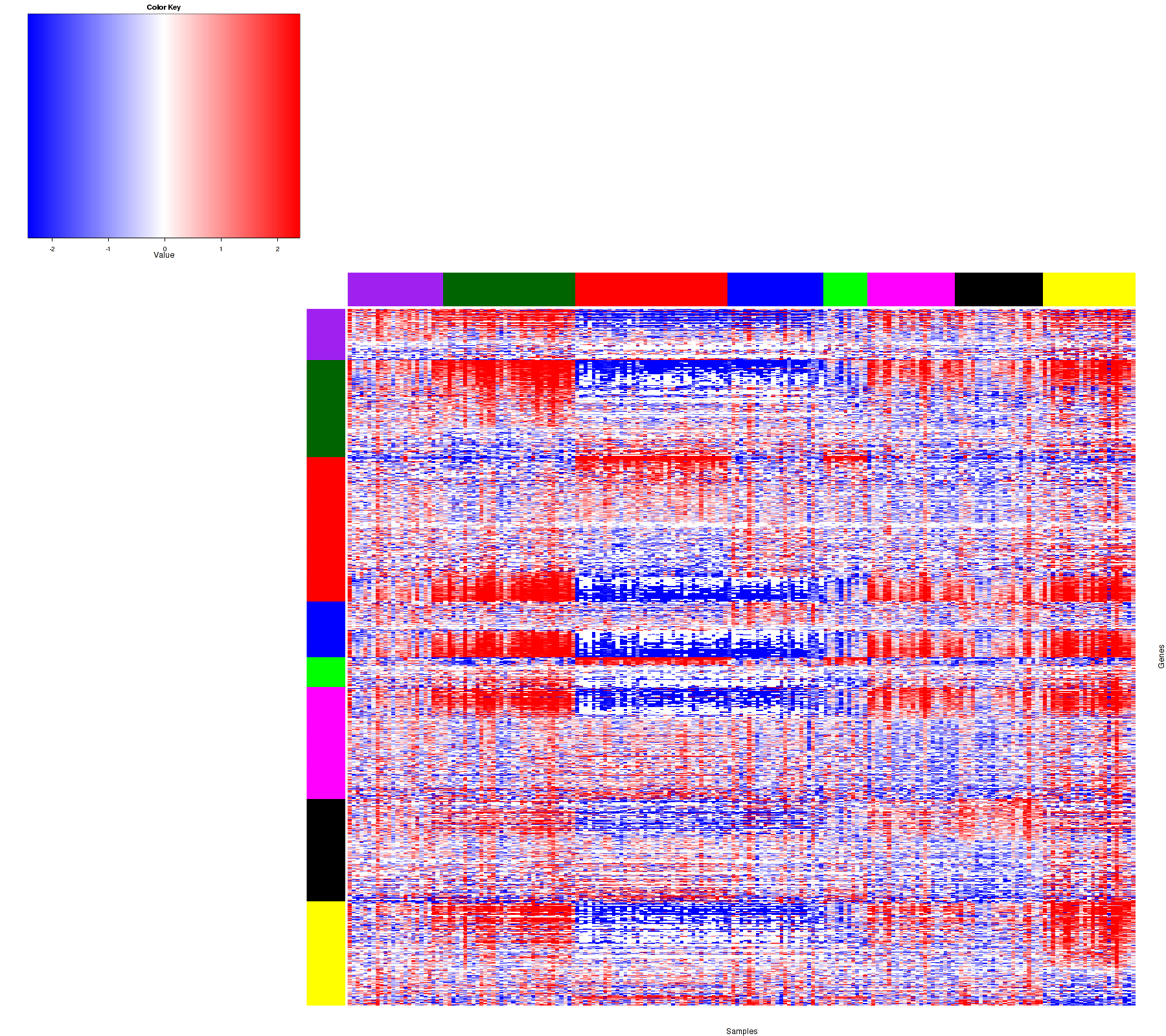 Figure 1. Get High-res Image Samples were separated into 8 clusters. Shown are 197 samples and 1406 marker miRs. The color bar of the row indicates the marker miRs for the corresponding cluster.