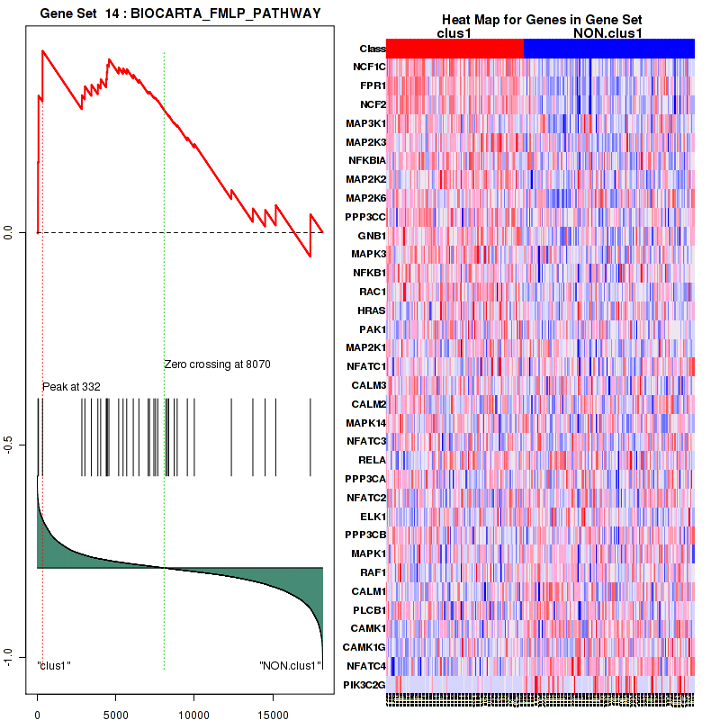 Table S1. Get Full Table This table shows a Running Enrichment Score (RES) of each gene in this pathway, that is, the enrichment score at this point in the ranked list of genes. All genes are ranked by Signal-to-Noise (S2N), a measure of similarity as default and are used to obtain ES matrix of all genes. In this way, GSEA tool uses expression pattern of not only overlapped genes but also not-overlapped genes to produce ES matrix.