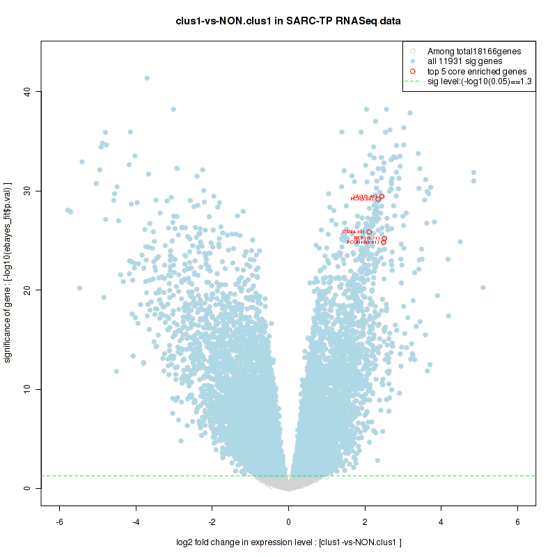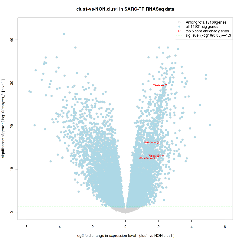 Figure S2. Get High-res Image For the top 5 core enriched genes in the pathway: BIOCARTA BCR PATHWAY, this volcano plot shows how much they are up/down-regulated and significant. The significance was calculated by empirical bayesian fit