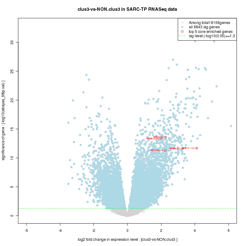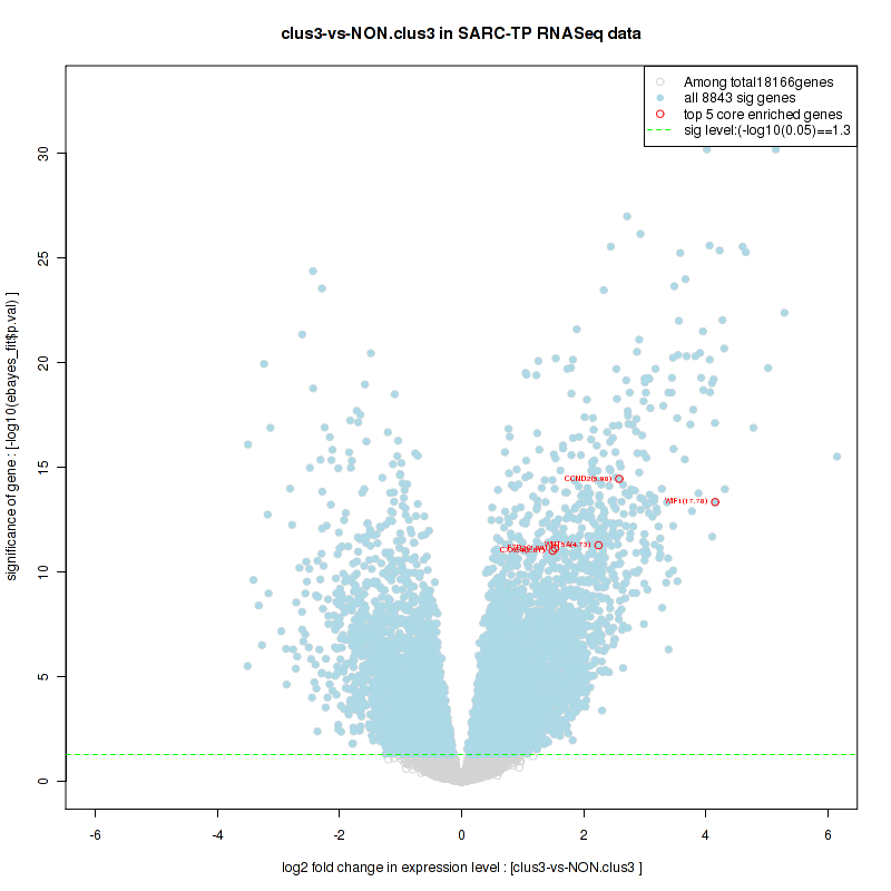 Figure S58. Get High-res Image For the top 5 core enriched genes in the pathway: KEGG WNT SIGNALING PATHWAY, this volcano plot shows how much they are up/down-regulated and significant. The significance was calculated by empirical bayesian fit
