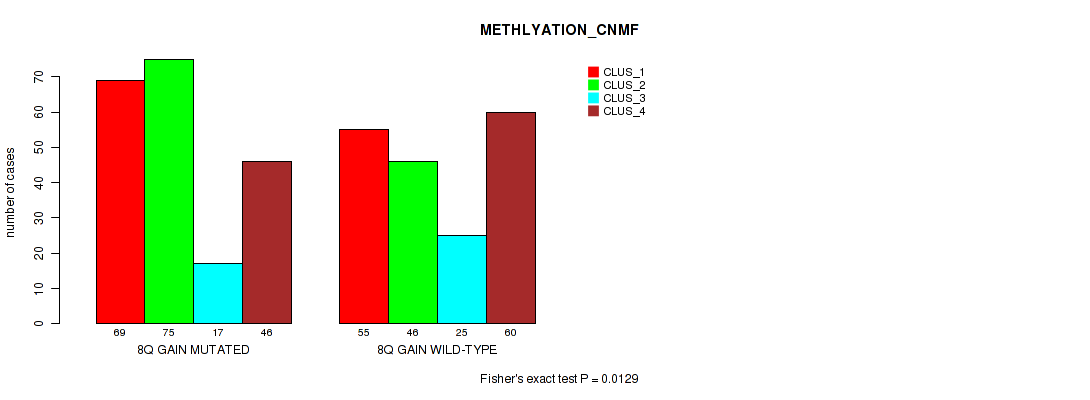 8q gain cnv correlated to 'CN_CNMF', 'METHLYATION_CNMF', 'MRNASEQ_CNMF', 'MRNASEQ_CHIERARCHICAL', 'MIRSEQ_CNMF', and 'MIRSEQ_CHIERARCHICAL'.