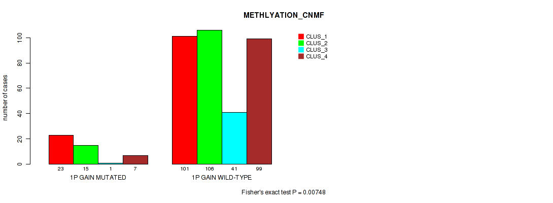 1p gain cnv correlated to 'CN_CNMF', 'METHLYATION_CNMF', 'RPPA_CNMF', 'MRNASEQ_CNMF', 'MIRSEQ_CNMF', and 'MIRSEQ_CHIERARCHICAL'.