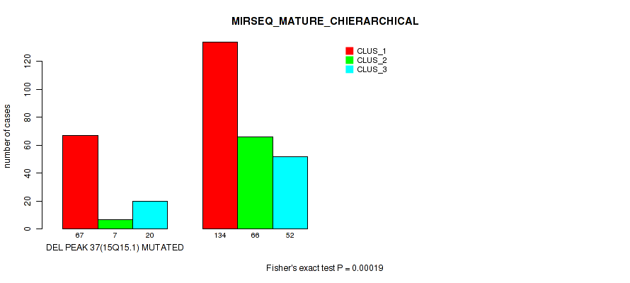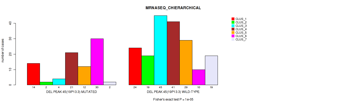 del_19p13.3 cnv correlated to 'CN_CNMF', 'METHLYATION_CNMF', 'RPPA_CNMF', 'RPPA_CHIERARCHICAL', 'MRNASEQ_CNMF', 'MRNASEQ_CHIERARCHICAL', 'MIRSEQ_CNMF', 'MIRSEQ_CHIERARCHICAL', 'MIRSEQ_MATURE_CNMF', and 'MIRSEQ_MATURE_CHIERARCHICAL'.