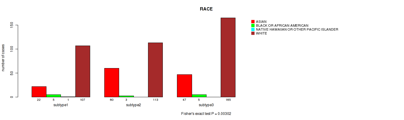 CNMF clustering analysis on sequencing-based mRNA expression data identified 3 subtypes that correlate to 'YEARS_TO_BIRTH', 'NEOPLASM_DISEASESTAGE', 'PATHOLOGY_T_STAGE', 'PATHOLOGY_N_STAGE', 'GENDER', 'HISTOLOGICAL_TYPE', and 'RACE'.