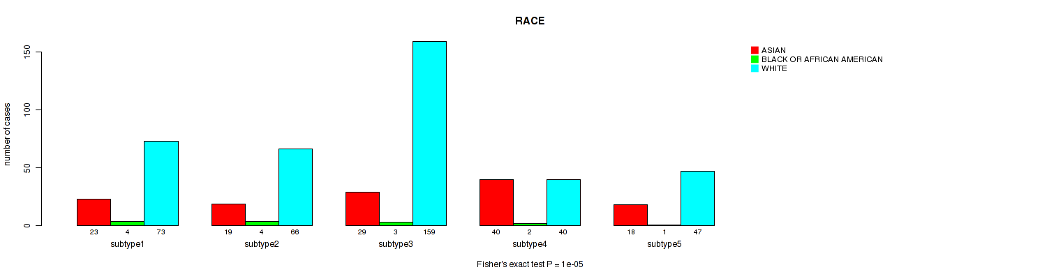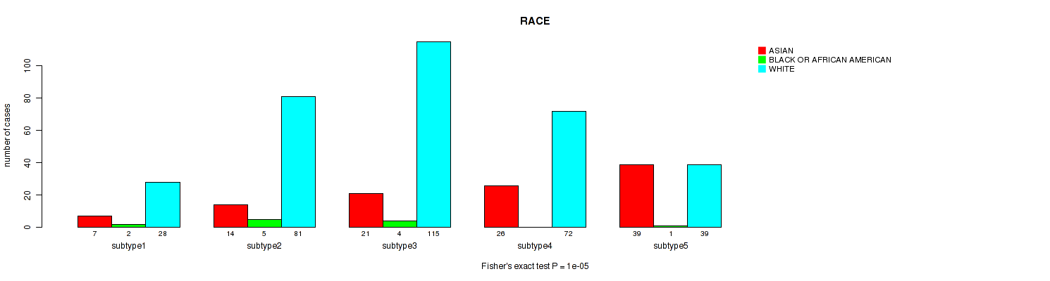 Consensus hierarchical clustering analysis on sequencing-based mRNA expression data identified 5 subtypes that correlate to 'YEARS_TO_BIRTH', 'NEOPLASM_DISEASESTAGE', 'PATHOLOGY_T_STAGE', 'PATHOLOGY_N_STAGE', 'GENDER', 'HISTOLOGICAL_TYPE', and 'RACE'.
