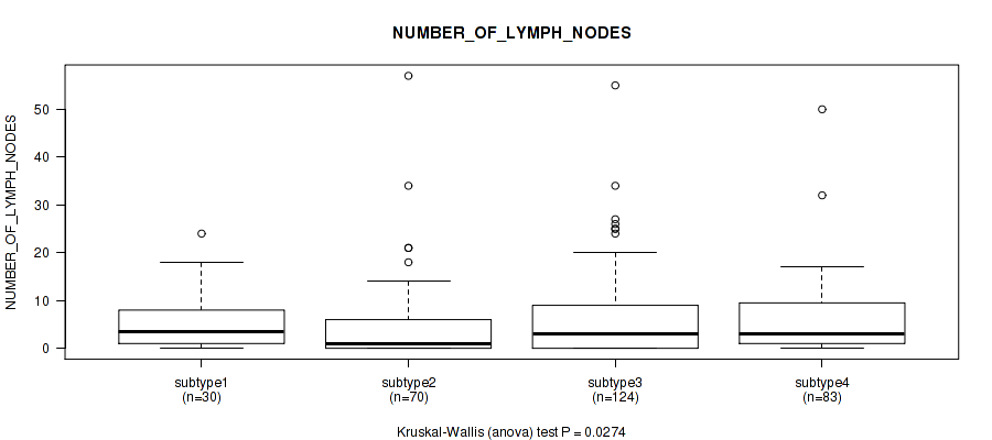 Table S118. Clustering Approach #8: 'MIRseq Mature cHierClus subtypes' versus Clinical Feature #12: 'NUMBER_OF_LYMPH_NODES'
