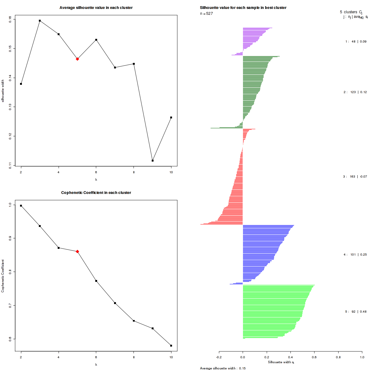 The cophenetic correlation coefficients and average silhouette values are used to determine the k with the most robust clusterings. From the plot of cophenetic correlation versus k, we select modes and the the point preceding the greatest decrease in cophenetic correlation coefficient, and from these choose the k with the highest average silhouette value.
