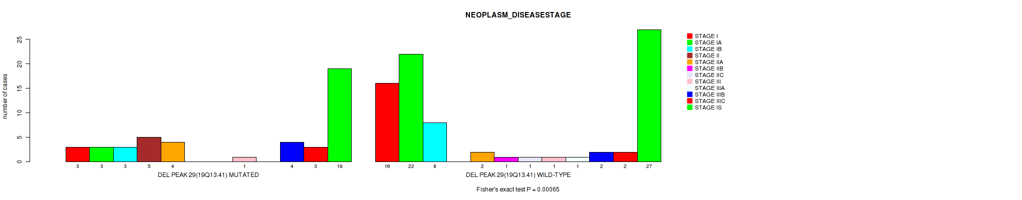 Figure S6. Get High-res Image Gene #44: 'del_19q13.41' versus Clinical Feature #3: 'NEOPLASM_DISEASESTAGE'