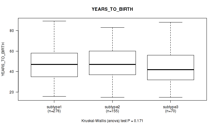 | YEARS TO BIRTH | Kruskal-Wallis (anova) |