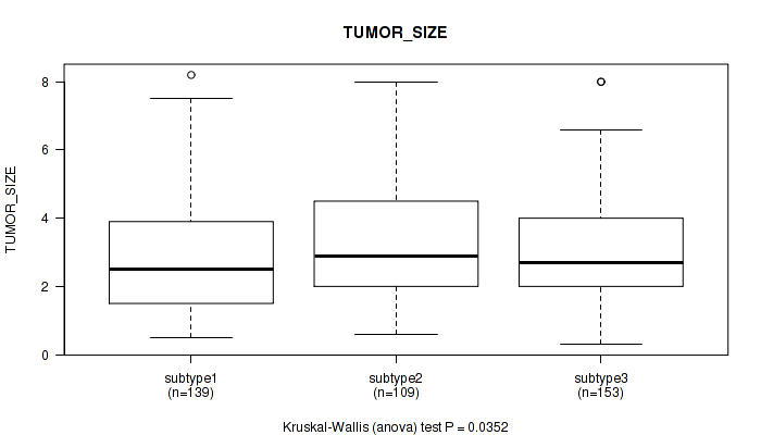 Figure S168. Get High-res Image Clustering Approach #10: 'MIRseq Mature cHierClus subtypes' versus Clinical Feature #15: 'TUMOR_SIZE'