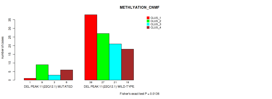 Table S64. Gene #11: 'del_22q12.1' versus Molecular Subtype #2: 'METHLYATION_CNMF'