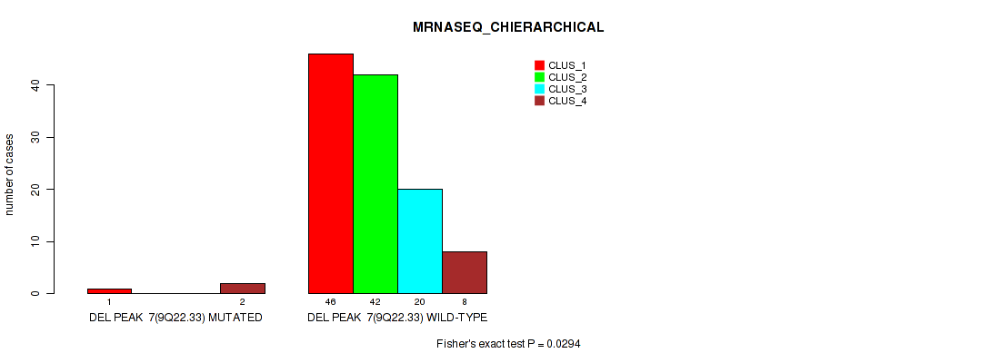 del_9q22.33 cnv correlated to 'RPPA_CNMF', 'RPPA_CHIERARCHICAL', 'MRNASEQ_CNMF', and 'MRNASEQ_CHIERARCHICAL'.