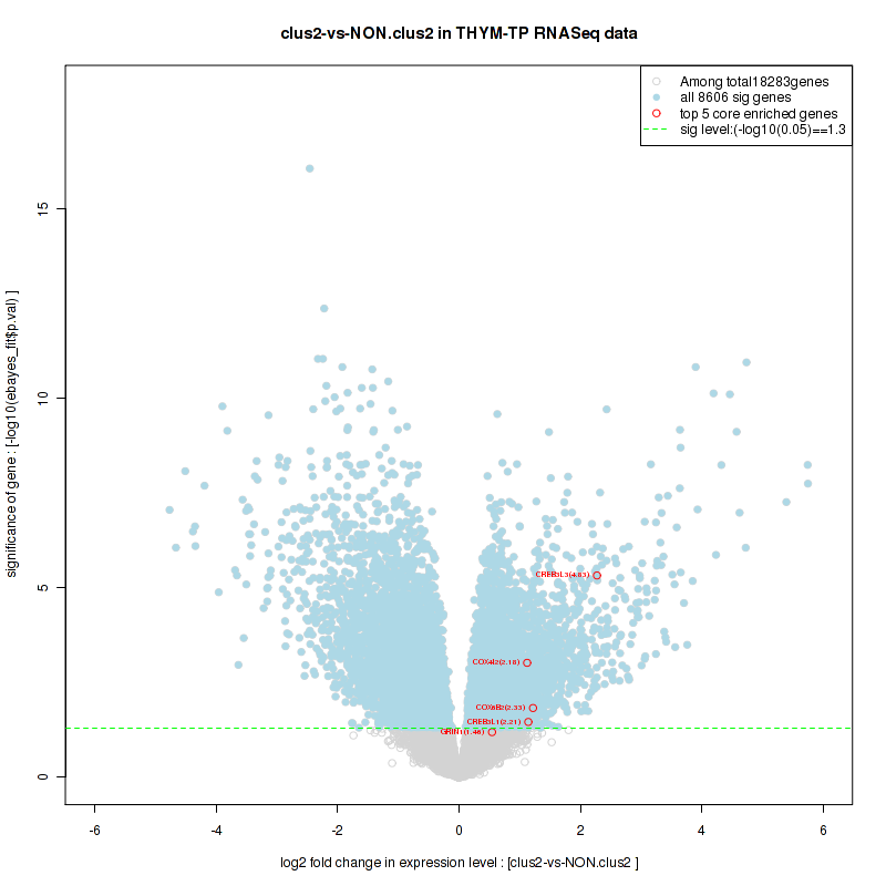 Figure S2.  Get High-res Image For the top 5 core enriched genes in the pathway: BIOCARTA CARM ER PATHWAY, this volcano plot shows how much they are up/down-regulated and significant. The significance was calculated by empirical bayesian fit
