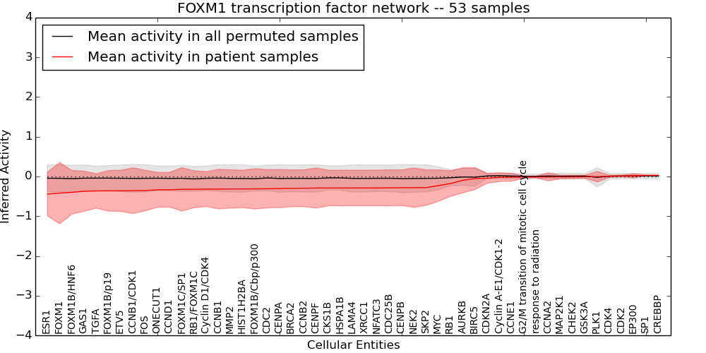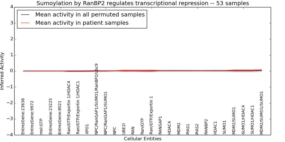 Figure S131. Get High-res Image This plot shows pathway concept perturbations across all samples against a permutation model. The concepts along the x-axis are sorted by lowest to highest mean activity for the real patient samples. Mean inferred activities are plotted along the y-axis as a colored band showing the average level and one standard deviation range. Real samples are shown in red and permuted samples in black.