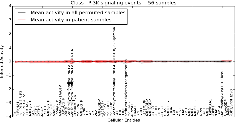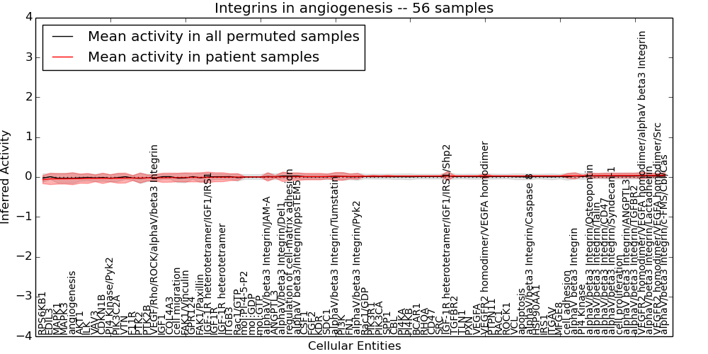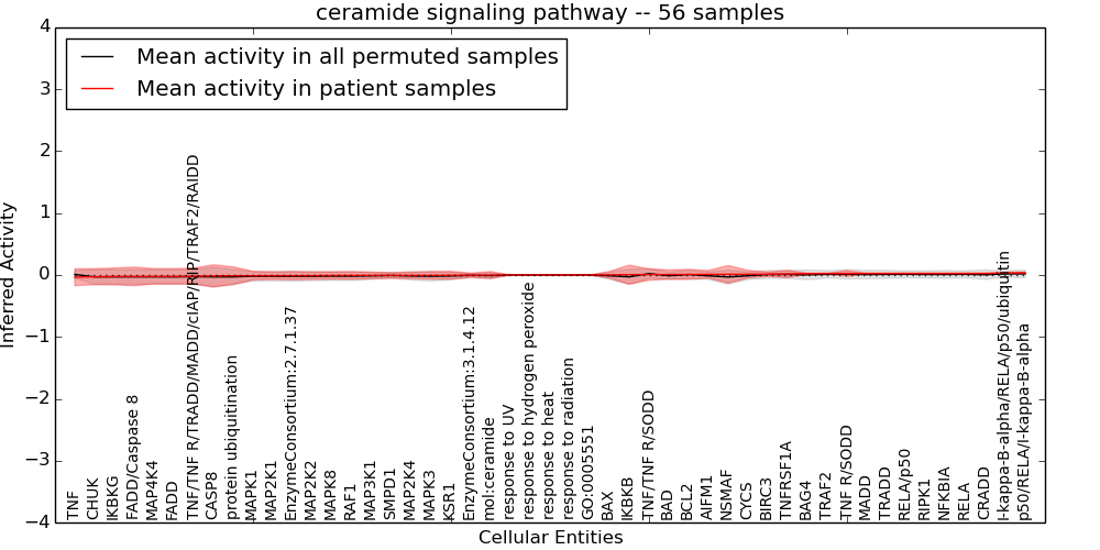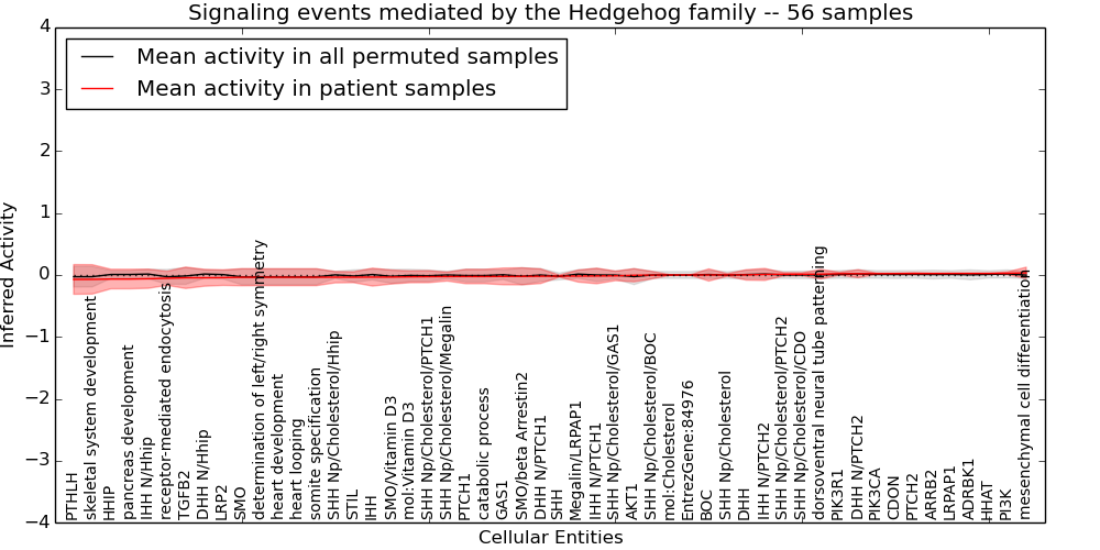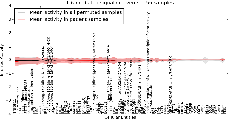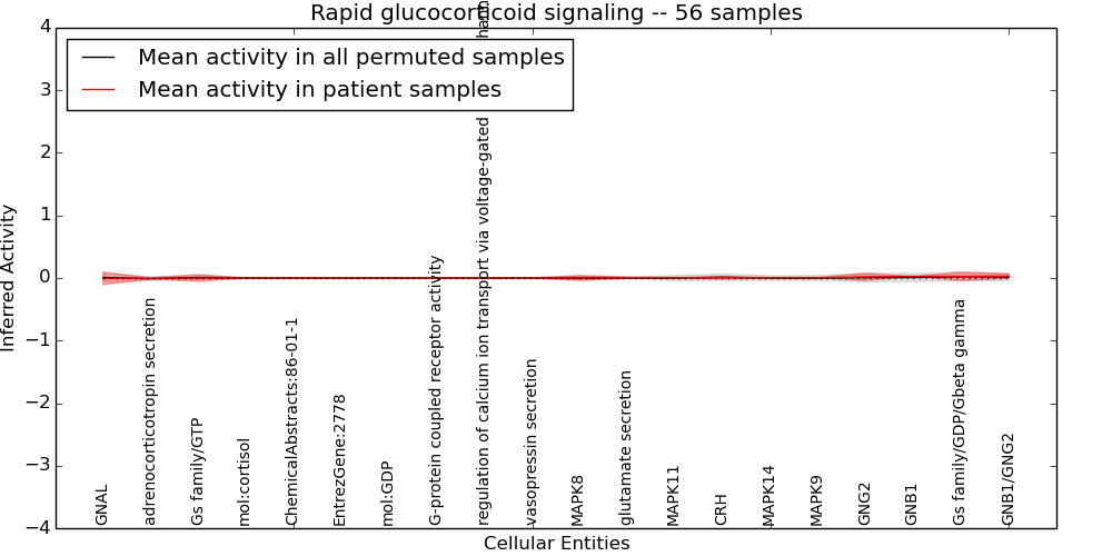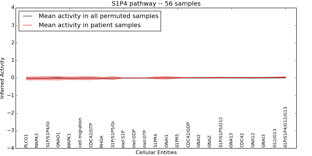 Figure S131. Get High-res Image This plot shows pathway concept perturbations across all samples against a permutation model. The concepts along the x-axis are sorted by lowest to highest mean activity for the real patient samples. Mean inferred activities are plotted along the y-axis as a colored band showing the average level and one standard deviation range. Real samples are shown in red and permuted samples in black.